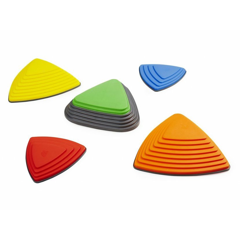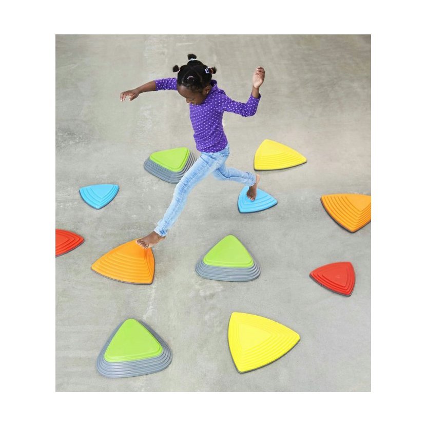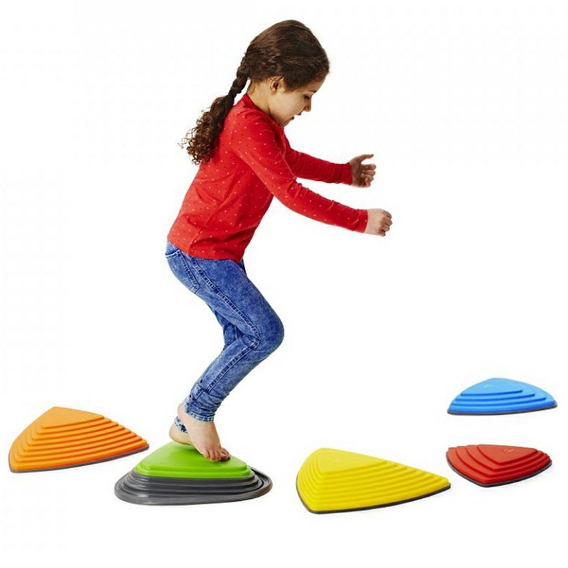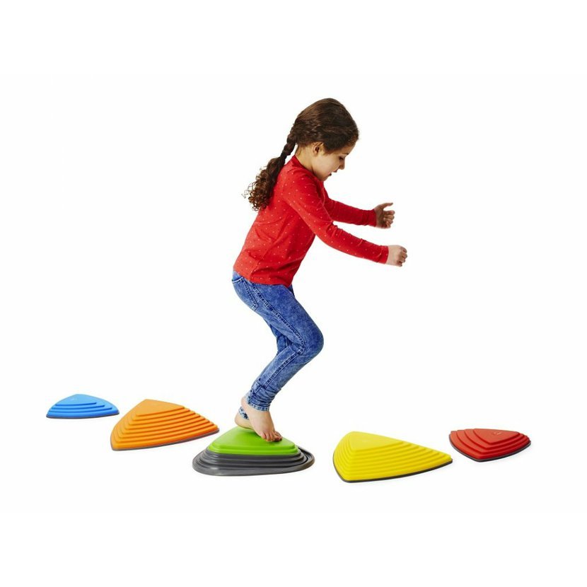 Každý kámen má na základně gumové výstupky, které zabraňují jejich uklouznutí a chrání také vnitřní podlahové plochy. Sada balančních barevných kamenů buduje u dětí sebevědomí při skákání, odhadování vzdálenosti, koordinaci a udržování rovnováhy.