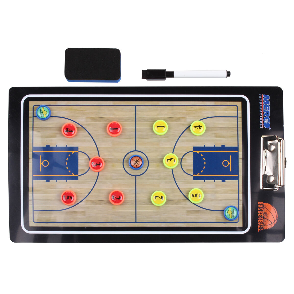 Trenérská tabule na basketbal je nezbytný doplněk každého basketbalového trenéra napříč všemi soutěžemi. Taktická basketbalová tabule Merco Basketbal 65 je oboustranná magnetická deska s barevným provedením celého basketbalového hřiště na straně jedné a barevným provedením poloviny basketbalového hřiště na straně druhé a to včetně dalších čtyř miniatur. Součástí basketbalové desky Merco Basketbal 65 je 13 magnetů (s motivy čísel, míče a rozhodčích), popisovač, mazací houbička a klip na další poznámky. Taktická deska Merco Basketbal 65 je nejsnazší a nejrychlejší cesta pro Vaše přesné herní pokyny hráčům kdykoliv během basketbalového zápasu.
