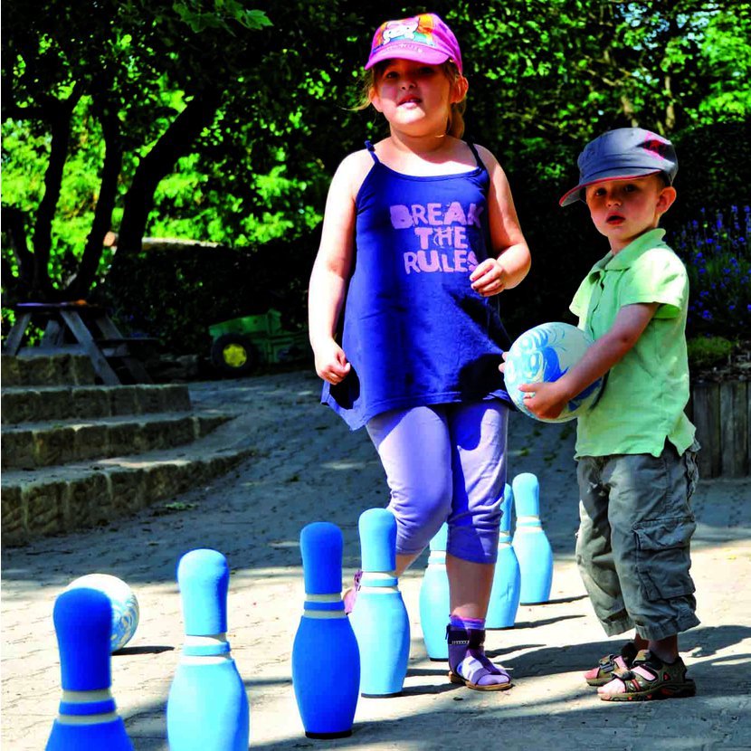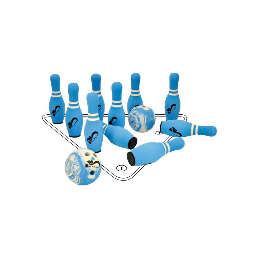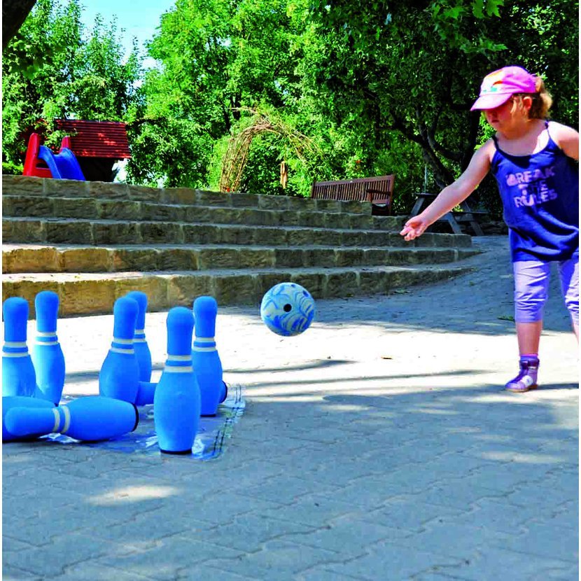 Pomocí trojúhelníkové hrací šablony je rozestavění kuželek snadné. 3 díry v kouli pomáhají správnému uchopení a usnadňují řídit směr koule.Materiál: EVA