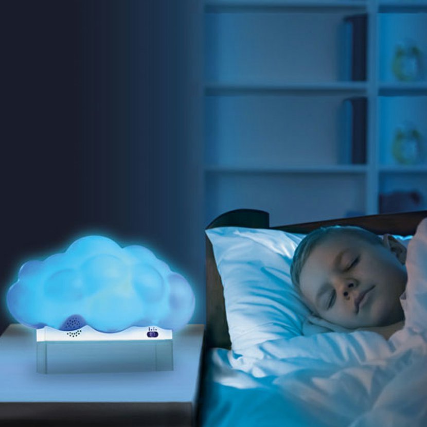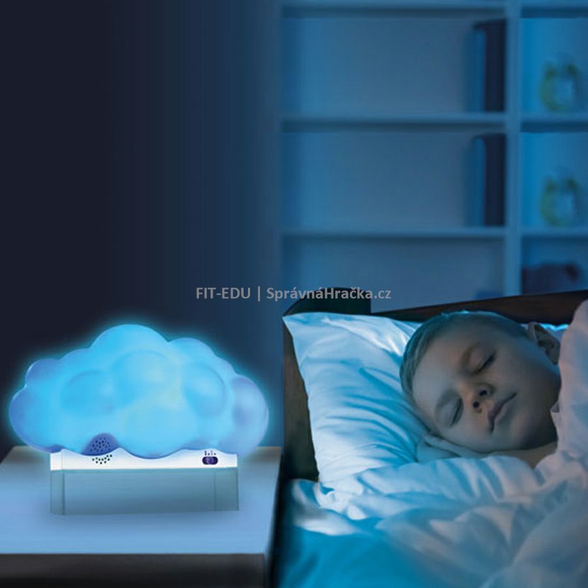 Obláček je příjemná a uklidňující dekorace pokojíčku. Příjemné měnící se barvy obláčku a zvuky oblohy pomůžou ke klidnému usínání. Přepínačem zvolíte režim jeden ze tří režimů... zvuky deště a barevné světlo - jen barevné světlo - zvuky bouřky a barevné světlo. Obláček využívá LED technologii, díky které má velmi nízkou spotřebu energie a automaticky se zhasíná po 40 minutách. Doporučený věk: 3+ Baterie: 3x AAA (nejsou součástí)