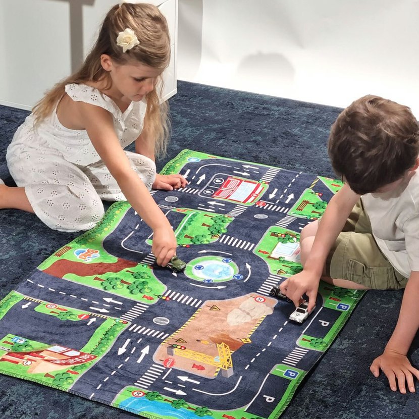 Silniční koberec z měkké tkaniny s 10ti semafory, které se na různých místech města cyklicky přepínají zelená/červená a umožňují simulovat běžnou dopravu ve městě. Koberec nabízí všechny základní objekty jako je stanice policie, nemocnice s heliportem, hasičská stanice, parkoviště, benzínová pumpa, staveniště, kruhový objezd atd. Na koberci tak děti využijí různé typy autíček pro zábavnou i poučnou hru. Děti budou moci řídit svá autíčka a poznávat pravidla silničního provozu prostřednictvím dopravních značek a signálů: semaforů, stopek, parkovacích míst a přechodů pro chodce. Součástí koberce jsou 3 malá auta (náhodné modely). Měkká polyesterová podložka s protiskluzovou vrstvou, která zabraňuje klouzání po podlaze. Rozměry koberce: 72 x 120 cm. Vhodné pro děti od 3 let. Pozor: Pouze povrchové mytí.