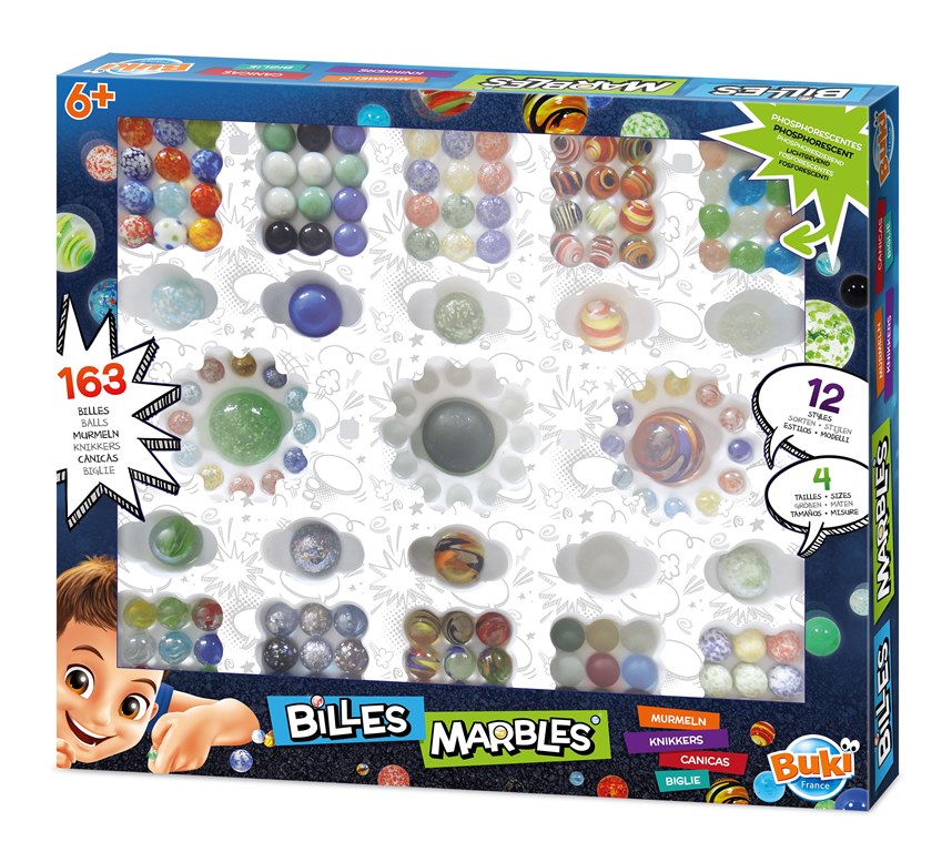 Luxusní sada 163 skleněných kuliček různých velikostí a vzhledu. Vzhled skleněnek je to co dělá rozdíl mezi touto sadou a ostatními běžnými kuličkami na trhu. V sadě jsou např. duhovky, perleťovky, žíhané, puntíkaté, mramorové, plnobarevné, metalické a dokonce i fosforeskující ve tmě. Celkem 12 druhů a 4 velikosti: 3 kuličky Ø33mm (v každé sadě jsou jiné motivy) 10 kuliček Ø24mm (v každé sadě jsou jiné motivy) 120 kuliček Ø16mm 30 kuliček Ø11mm Ideální dárek pro každého kluka nebo jako doplnění sbírky kuliček. Vhodné pro děti od 6 let