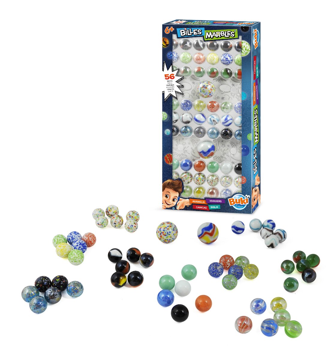 Box obsahující 56ks kuliček různých barev a textur pro hraní kuliček na hřišti nebo na zahradě! 2 velikosti kuliček (2 velké a 54 malých). Vhodné pro děti od 6 let.