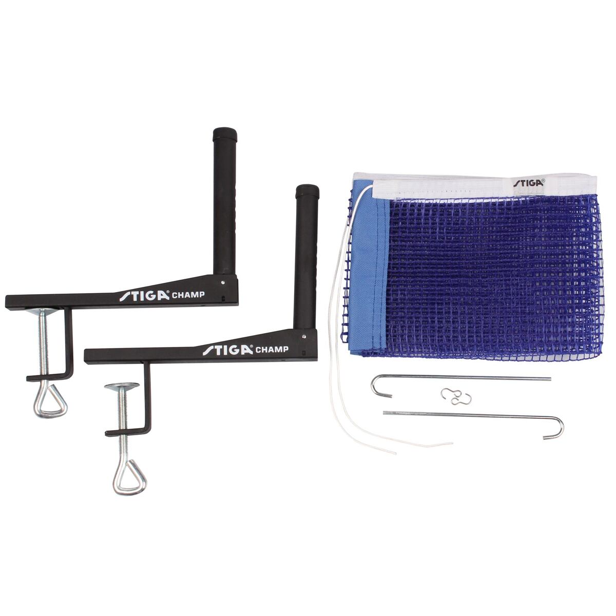 Síťka na stolní tenis s konstrukcí pro uchycení Stiga Champ je vhodná pro rekreační hráče. Díky klasickému utahování na šroub je její uchycení ke klasickým pingpongovým stolům rychlé a jednoduché. Síťka je vyrobená z modré nylonové síťoviny a konstrukce je ocelová. Možnost napnutí síťky zajišťují háčky a boční otvory v držácích. - pro rekreační hráče - modrá síťka - kovová konstrukce - jednoduché upevnění na šroub pro klasické stoly na stolní tenis - otvory pro napnutí síťky - hmotnost sady: cca 590 g