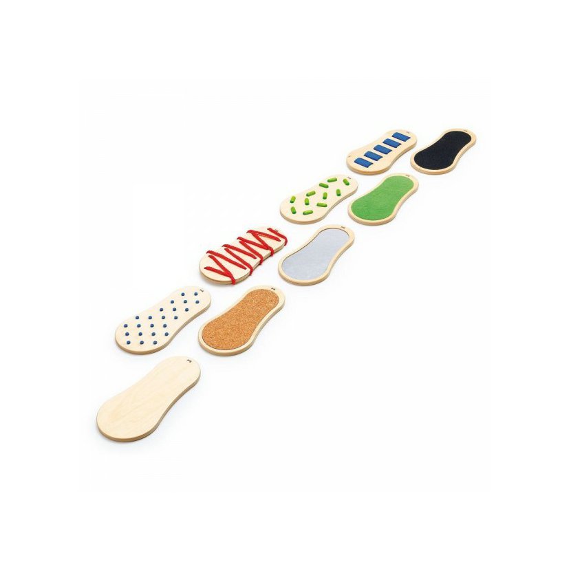 Obsah: 9 hracích prvků (28 x 14 x 2,26 cm) ve tvaru chodidla s různými povrchy a materiály,