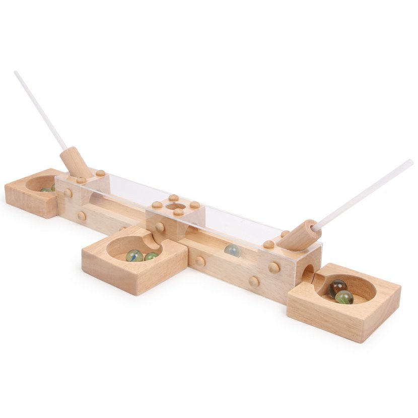 Kdo se svým výdechem vydrží déle? Při této hře soupeří dvojice hráčů proti sobě a mají pomocí silného foukání dostat kuličku do soupeřova prostoru. Po zasunutí trubiček (lze použít i obyčejná brčka) do držáků může hra začít. Pro vítězství ve hře je potřeba zvolit správnou strategii. Hra je vyrobena z masivního dřeva.