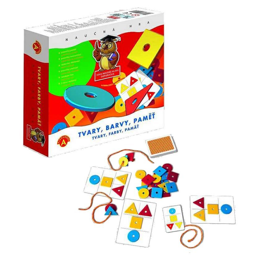 Zábavná naučná hra. Učí barvy a tvary, rozvíjí paměť, postřeh a koncentraci. Pro 2-4 hráče od 5 let. Na 55 kartách najdete vzory tvořené obrázce, které odpovídají tvarům plastových žetonů. Po chvilkovém prohlédnutí karty je třeba z žetonů složit zapamatovaný vzor. Ve druhé verzi hry musí její účastníci co nejrychleji navléct žetony na provázek. Jejich barva, tvar a počet se musí shodovat s kartou, kterou si hráč na krátkou chvilku prohlédl. Nečekaně zábavná hra, která učí barvy a tvary, rozvíjí paměť, postřeh a koncentraci. Skládej žetony různách tvarů a barev podle vzorové karty. Zapoj postřeh a paměť. Zaleží na každém detalu a rychlosti abys zvítězil! Při hře se s dětmi skvěle zabaví i celá rodina. - zábavné učení barev a tvarů - trénink soustředění, postřehu a paměti - 2 různé varianty hry Balení obsahuje: žetony–36 kusů, karty se vzory–55 kusů, provázky–4 kusy, podložky–4 kusy, český a slovenský návod