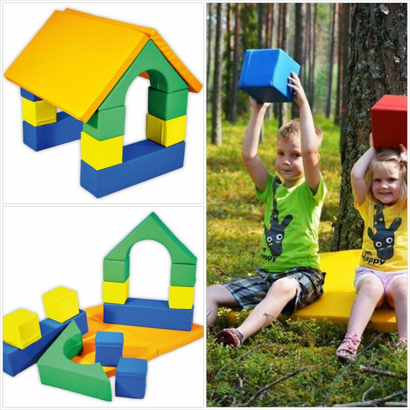 obsah: 1 x domeček (75 x 60 x 80 cm) - 2 x kvádr (15 x 15 x 60 cm), 8 x krychle (15 x 15 x 15 cm), 2 x žíněnka (5 x 120 x 180 cm), 2 x trojúhelníková podpěra střechy (30 x 15 x 60 cm),
