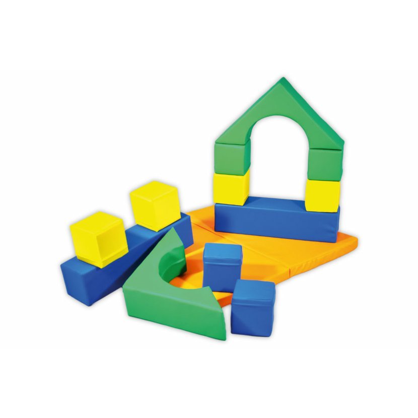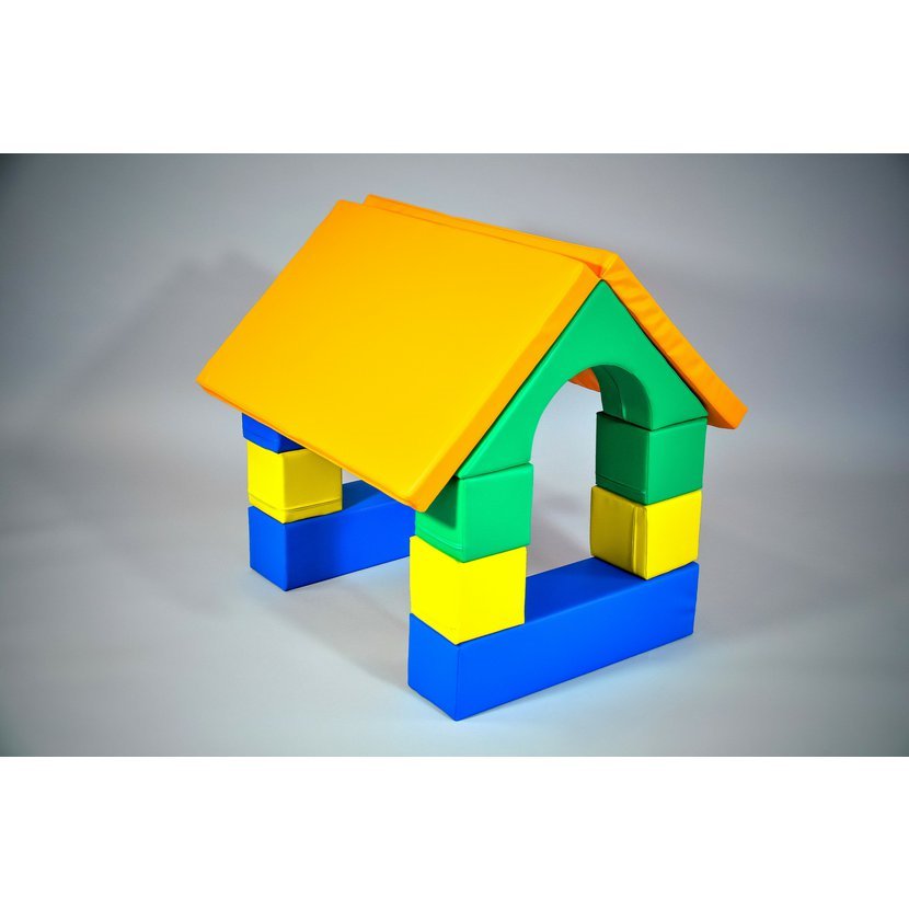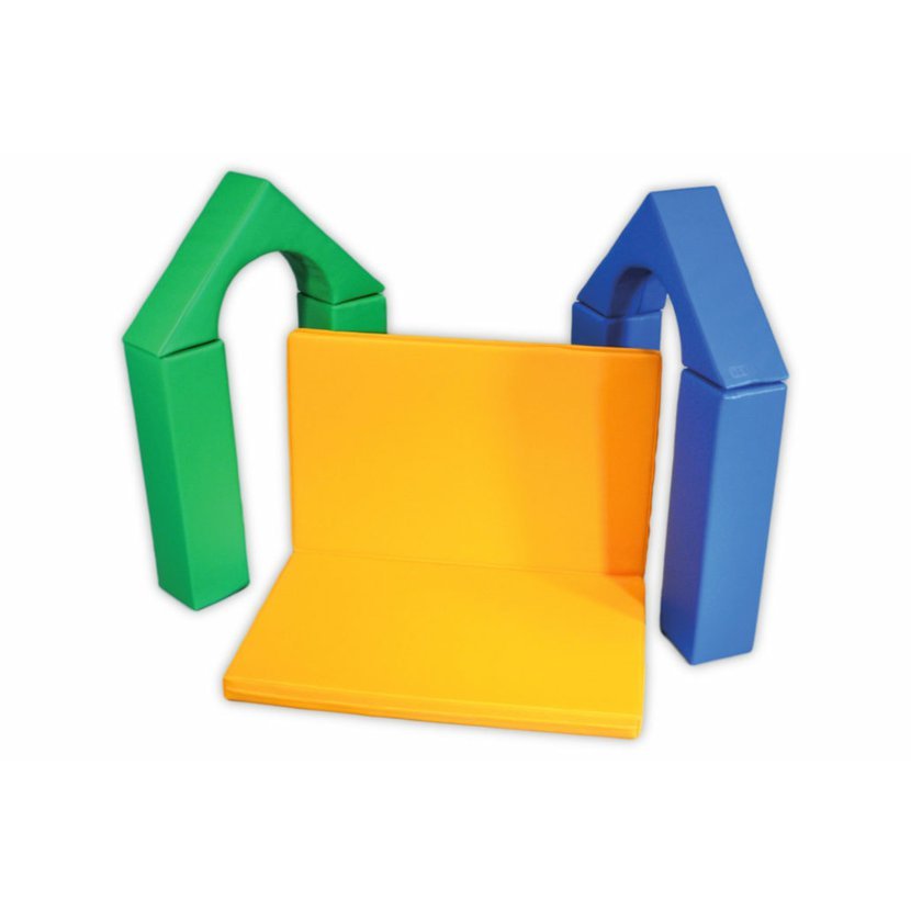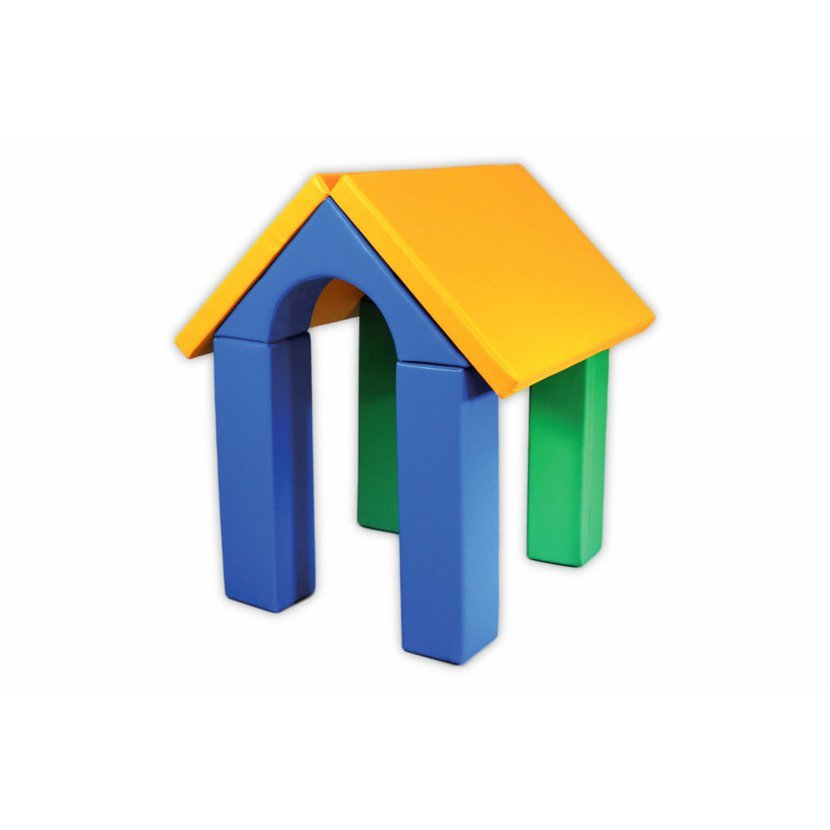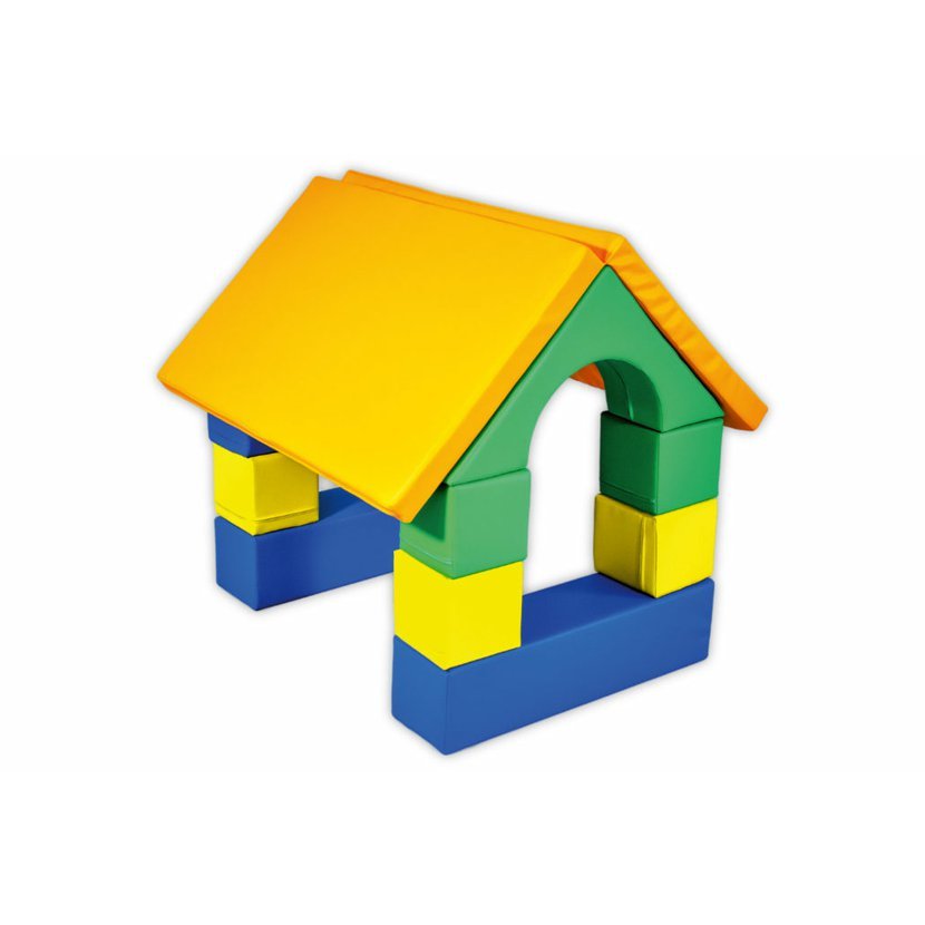 obsah: 1 x domeček (75 x 60 x 80 cm) - 2 x kvádr (15 x 15 x 60 cm), 8 x krychle (15 x 15 x 15 cm), 2 x žíněnka (5 x 120 x 180 cm), 2 x trojúhelníková podpěra střechy (30 x 15 x 60 cm)