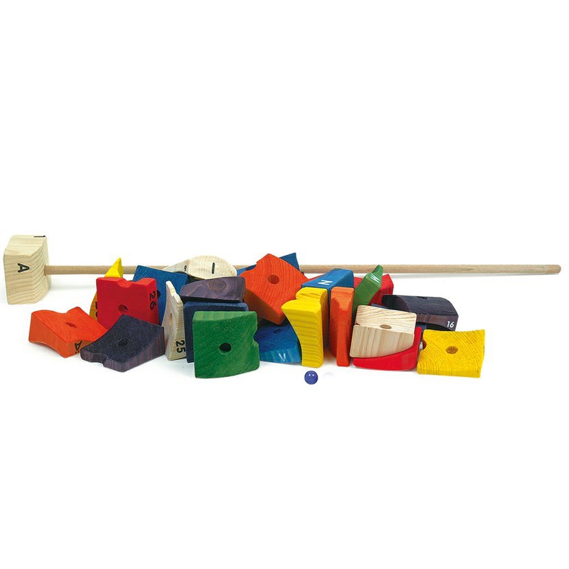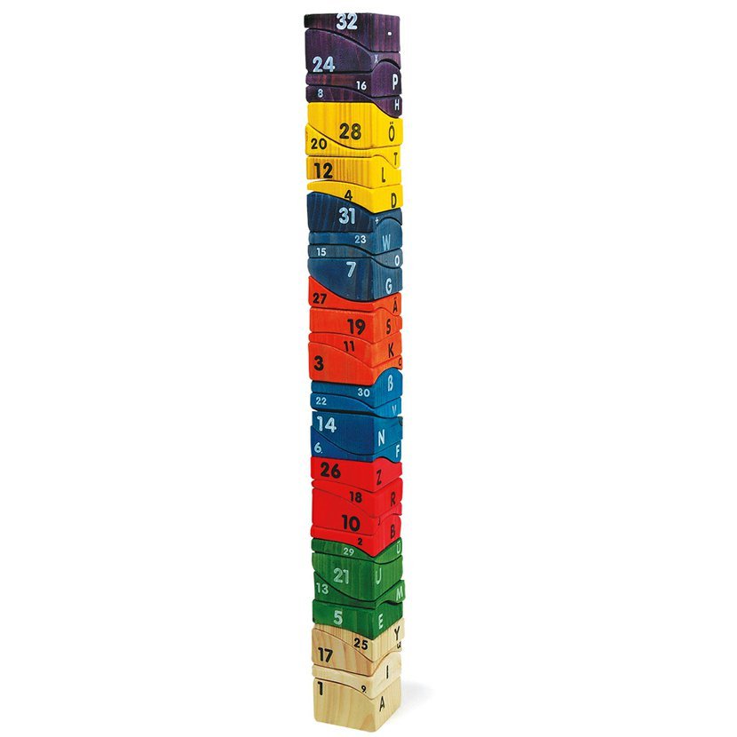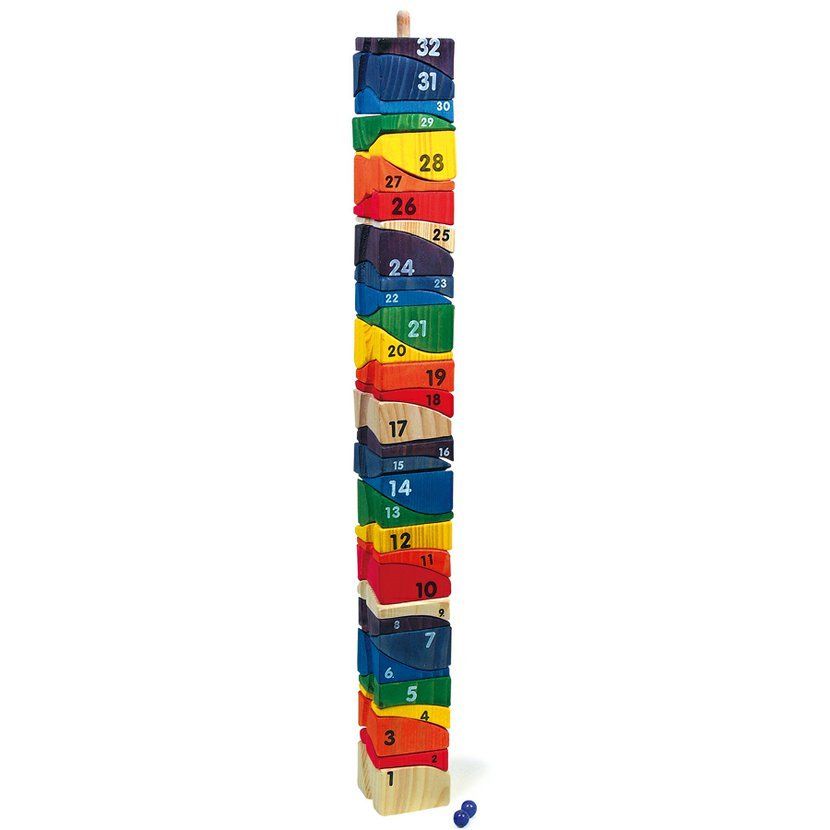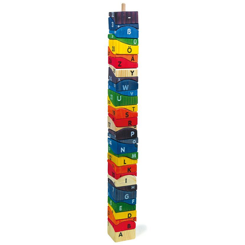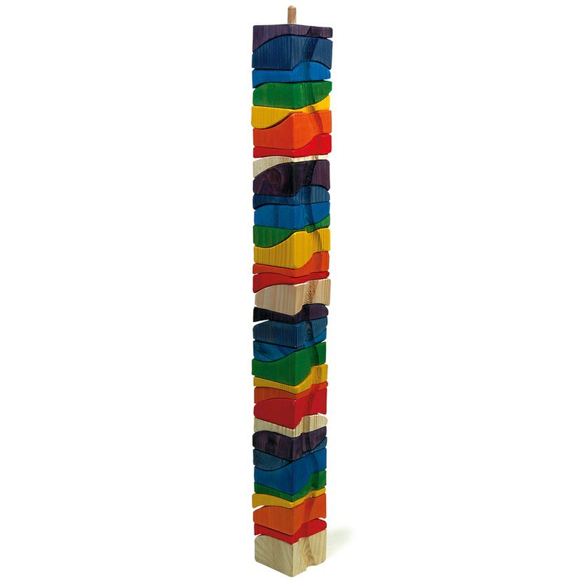 Úžasná pomůcka na učení abecedy, čísel a počítání, logiku a jemnou motoriku. Sdružení kostek stejné barvy umožňuje najít správné kostky. Věž může být sestavena podle barev duhy nebo podle jednotlivých barev. Po odejmutí střední tyče je možné využít věž jako hru obratnosti. Po složení jednotlivých dílů na sebe vznikne na boční straně věže dráha pro skleněné kuličky. Jednotlivé díly věže lze využívat jako puzzle a stavební kostky na kreativní hru a stavbu.