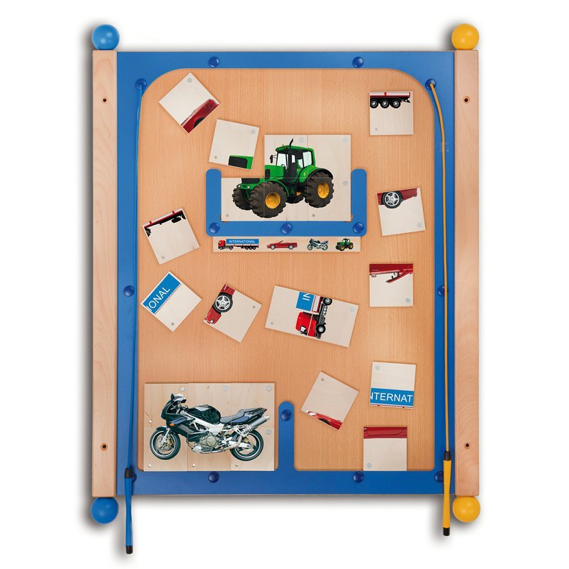 velikost 80 x 56 cm, uzavřený systém, stabilní systém uchycení s odstupem od stěny, obsahuje montážní set, pro 1 nebo dvě děti od 18 měsíců. Nástěnné hry představují atraktivní prostř