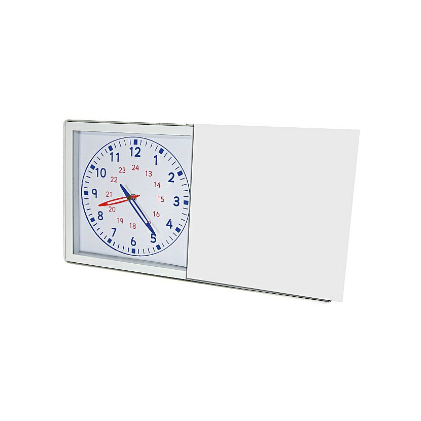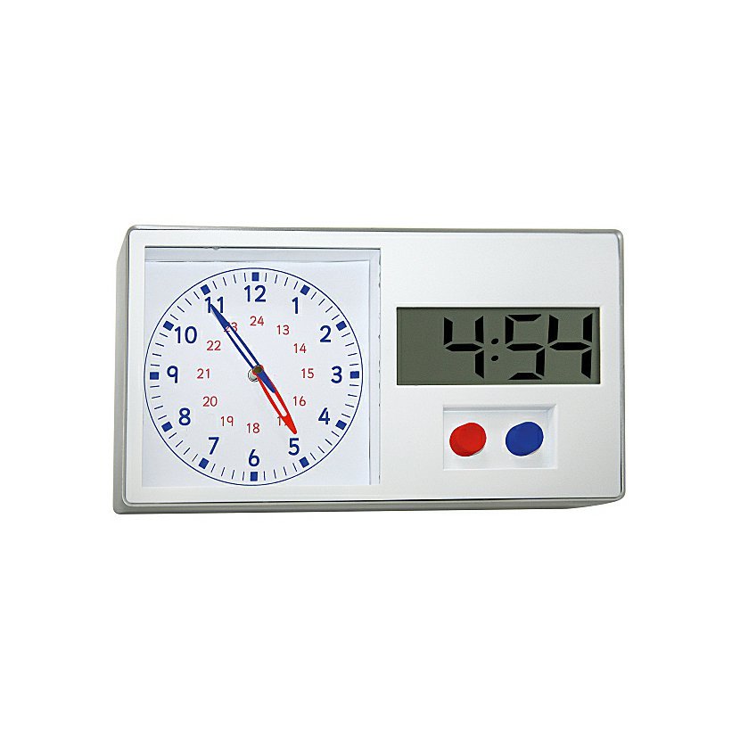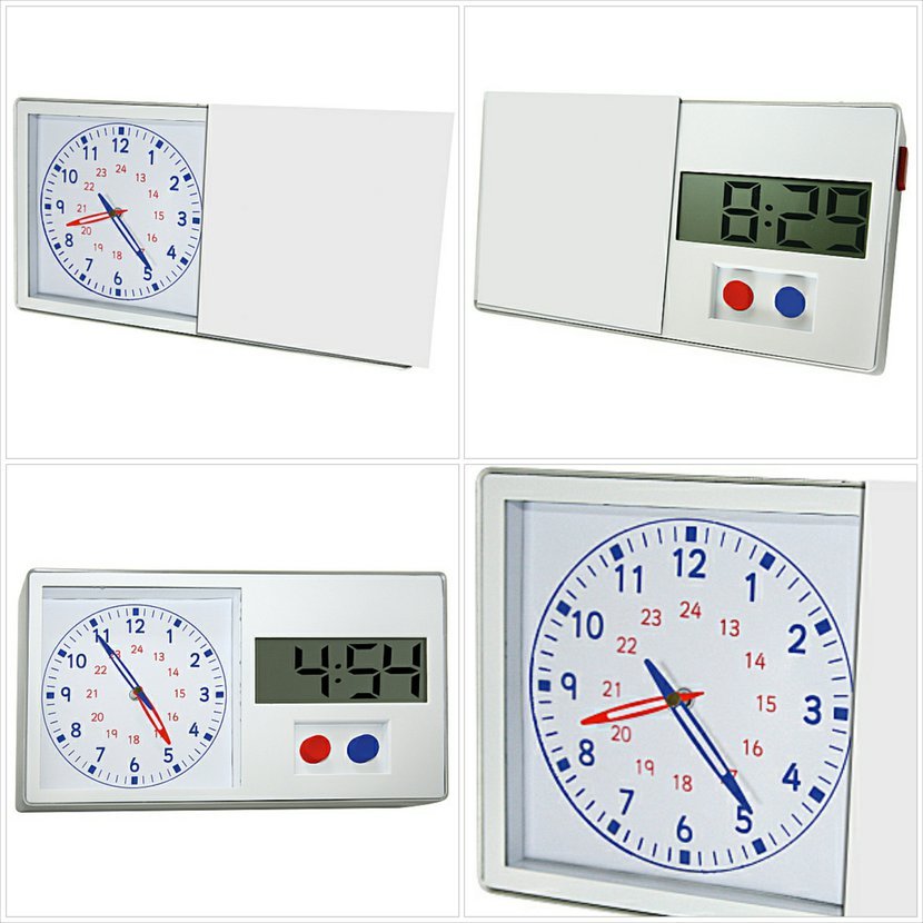 Zobrazení analogových hodin označuje denní, noční a minutové časy, digitální hodiny pracují jak v režimu 12 hodin tak v režimu 24 hodin. Učební hodiny lze umístit buď na stůl, nebo pověsit na zeď.