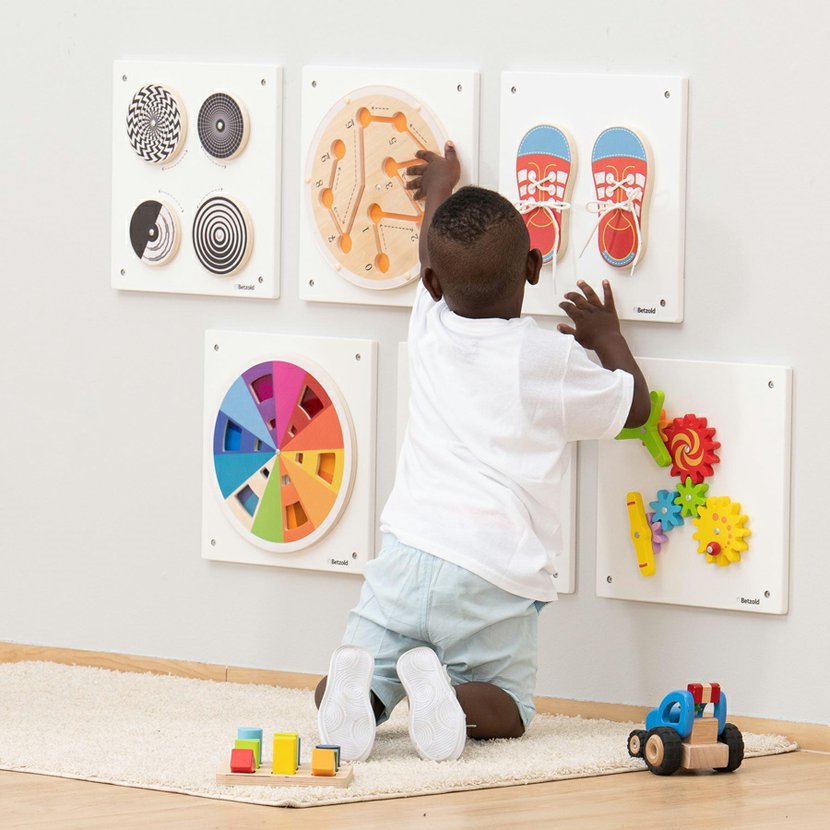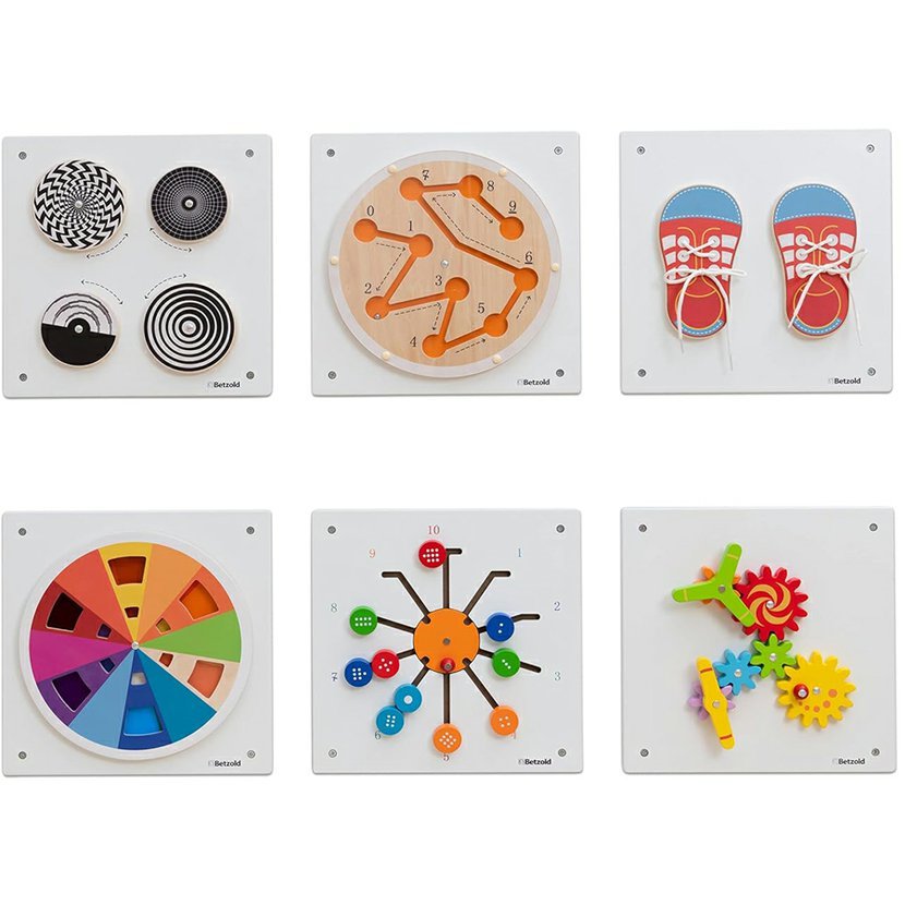 Tato skvělá sada obsahuje šest různých nástěnných her, které podporují rozvoj motorických dovedností dítěte. Otáčením, skládáním a posouváním děti objevují stále nové věci a rozvíjejí své schopnosti.