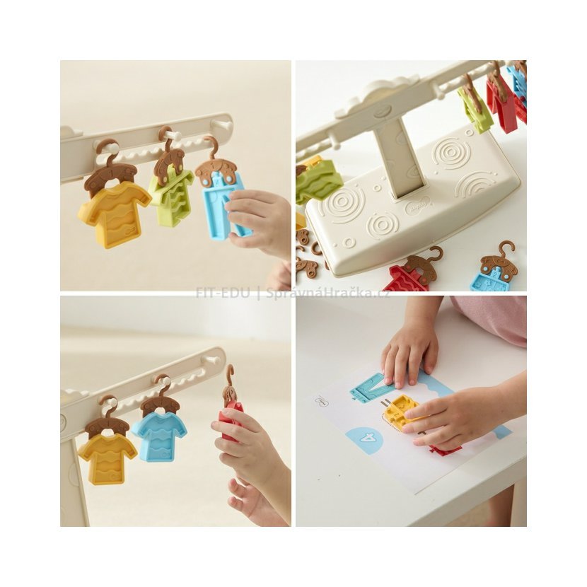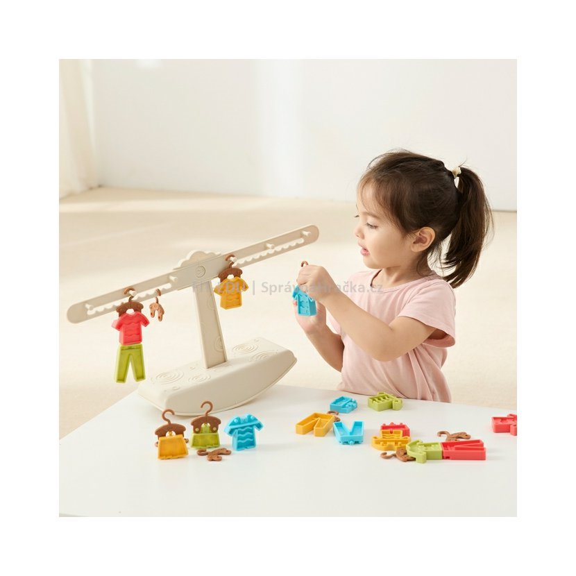 Objevování rovnováhy – zavěšováním oblečení na váhu se učí, jak udržet správnou stabilitu.
