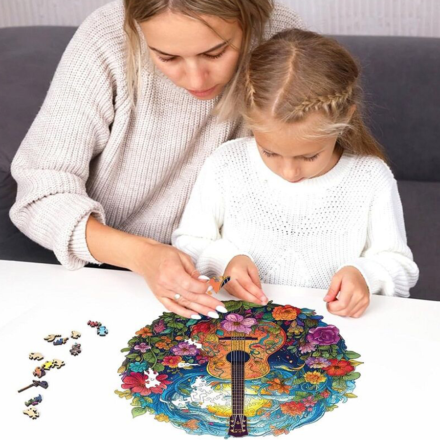 Puzzle s obrázkem kytary v květinách je unikátní dřevěné skládací puzzle, které spojuje kvalitní řemeslné zpracování s ekologicky odpovědným přístupem. Je vyrobeno z 5 mm FSC® certifikovaného dřeva, které zaručuje, že při výrobě byly dodrženy nejvyšší standardy ve správě lesů, což přispívá k udržitelnosti a ochraně biodiverzity. Každý z jedinečných 200 dílků skládačky je precizně vyřezán laserem, což zajišťuje dokonalou přesnost a hladkost hran, čímž usnadňuje skládání i manipulaci s dílky. Barevný a detailní obraz je reprodukován pomocí moderní technologie UV digitálního tisku, což přináší realistické a živé barvy do každého kousku skládačky. Toto puzzle je výzva pro všechny milovníky skládaček, kterým poskytne hodiny zábavy. Je také dobrou příležitostí, jak dát dohromady celou rodinu a přátele. Složený obrázek může sloužit jako krásný a dekorativní doplněk pro Váš prostor. Balení obsahuje: 200 dílků puzzle, úložný box, fólii na podlepení, samolepky pro montáž na zeď, návod. Hlavní vlastnosti: obsahuje 200 jedinečných dílkůUV digitální potiskprémiová kvalita puzzle 100% FSC® dřevodílky precizně vyřezány laseremrozvíjí logické myšlení a motorikusoučástí balení fólie na podlepení puzzleunikátní tvary a design