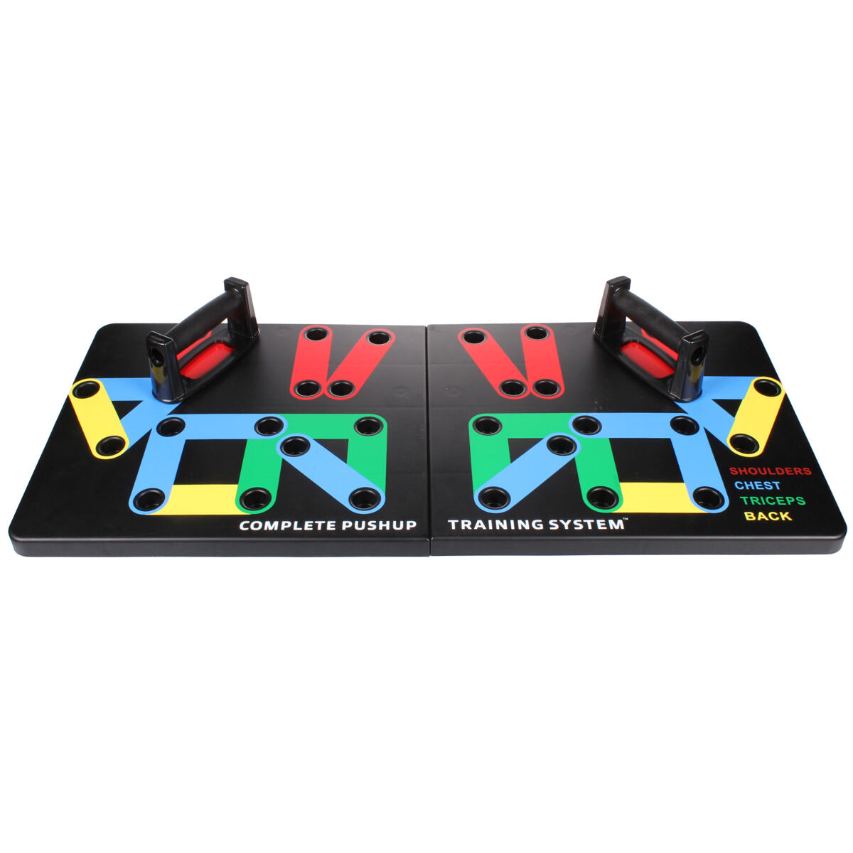 Multifunkční deska na kliky Merco Excellent Splice je určená na cvičení a posílení tricepsů, prsou a zad. Stačí jednoduše nastavit přiložené opěrky podle barevně rozlišených poloh na desce a můžete začít cvičit. Skládací deska i opěrky jsou vyrobené z odolného ABS plastu, opěrky jsou opatřené silikonovými protiskluzovými rukojetěmi. Tréninková deska Excellent Splice se skládá ze dvou částí, po sestavení má rozměry (D x Š x V) 90 x 39 x 3 cm a váží necelých 2,2 kg, rukojeti opěrek jsou široké 13 cm. Deska nabízí 14 nastavení poloh pro cvičení: 4 na ramena (červená barva), 3 na tricepsy (zelená barva), 5 na prsa (modrá barva) a 2 na záda (žlutá barva). Díky tomu je multifunkční deska Excellent Splice ideální doplněk každé domácí tělocvičny či pro školy.