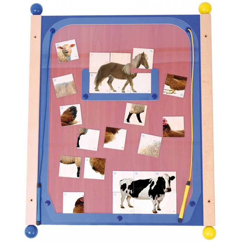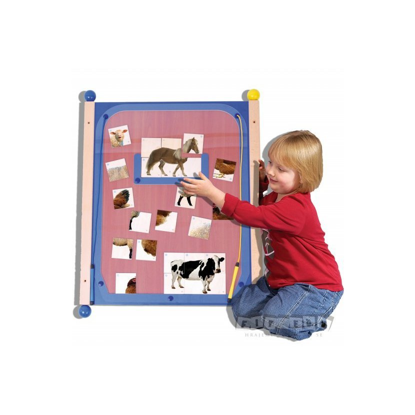 velikost 80 x 56 cm, uzavřený systém, stabilní systém uchycení s odstupem od stěny, obsahuje montážní set, pro 1 nebo dvě děti od 18 měsíců. Nástěnné hry představují atraktivní prostř