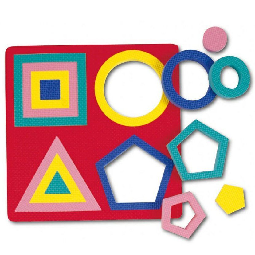 obsah: základní deska 30 x 30 x 1,2 cm, 4 x čtverec, 4 x trojúhelník, 4 x kolečko, 4 x pětiúhelník,