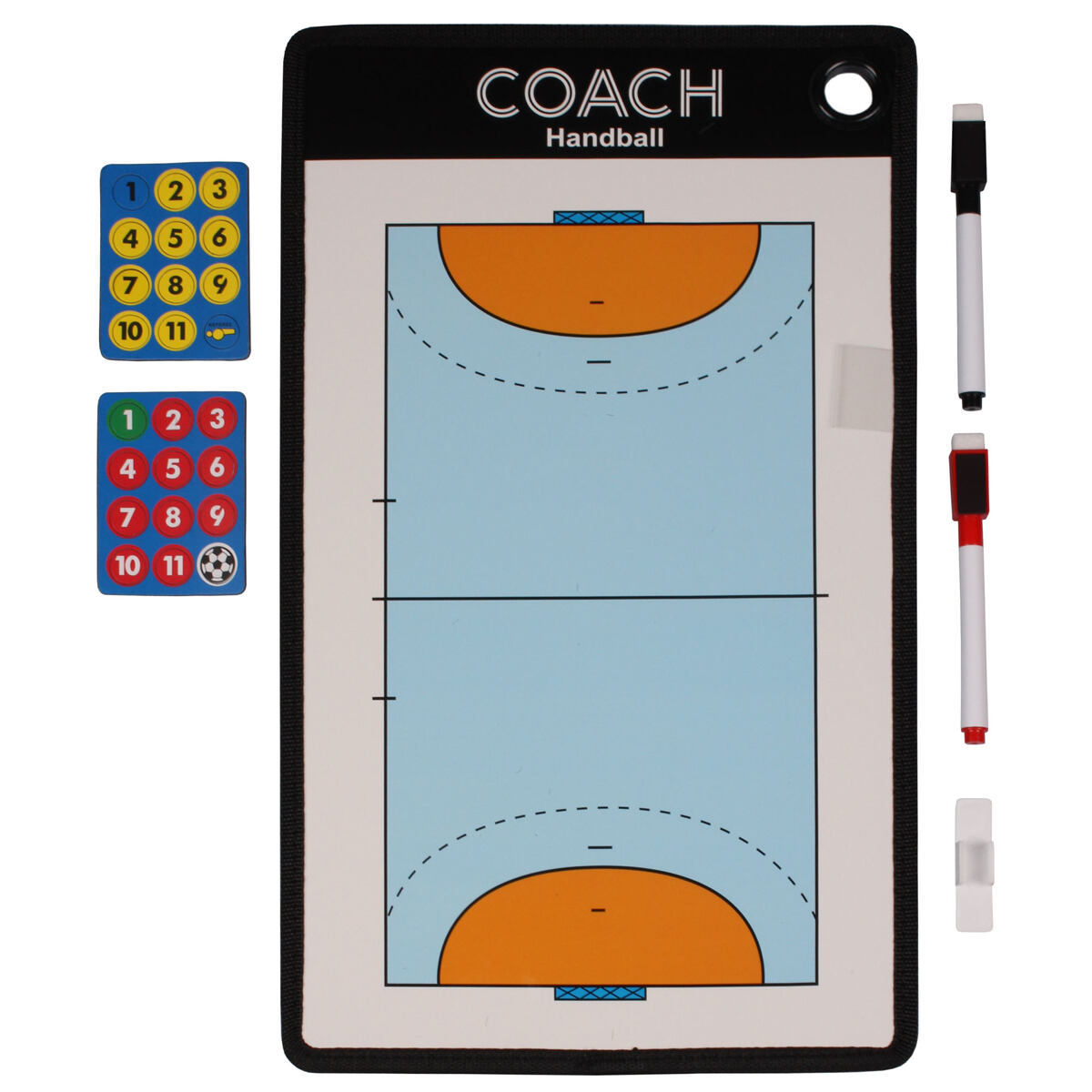 Merco Handball 38 patří mezi základní vybavení každého trenéra házené a slouží pro demonstrování a plánování herních strategií. Pro rozmístění hráčů v poli využijete dvě sady odlišně barevných magnetů s čísly a pro další tahy a znázornění pohybů hráčů popisovač s houbičkou. Magnetická tabule nabízí z jedné strany náhled na celé hřiště a z druhé strany na polovinu hřiště. Taktická deska Merco Handball 38 je nejsnazší a nejrychlejší cesta pro vaše přesné herní pokyny hráčům kdykoliv během zápasu! - rozměry tabule: 38 x 23 cm - hmotnost balení: cca 0,4 kg