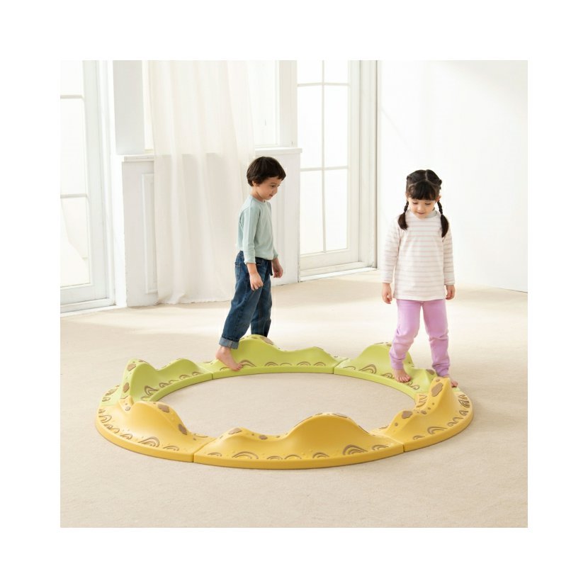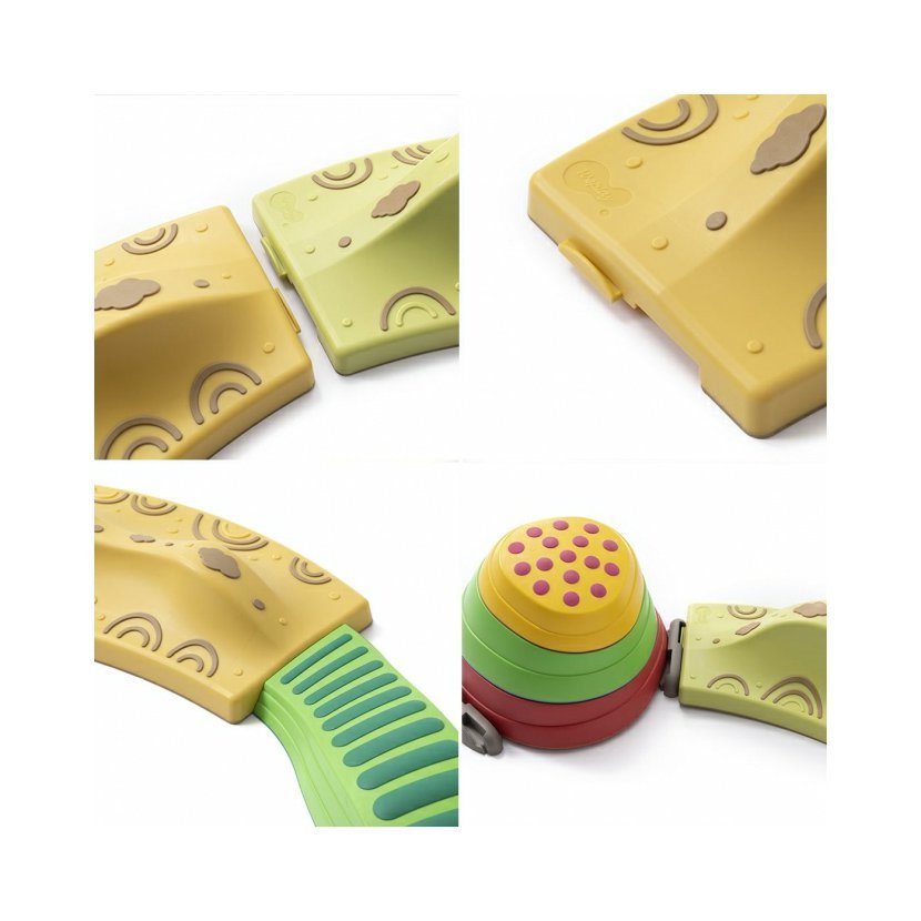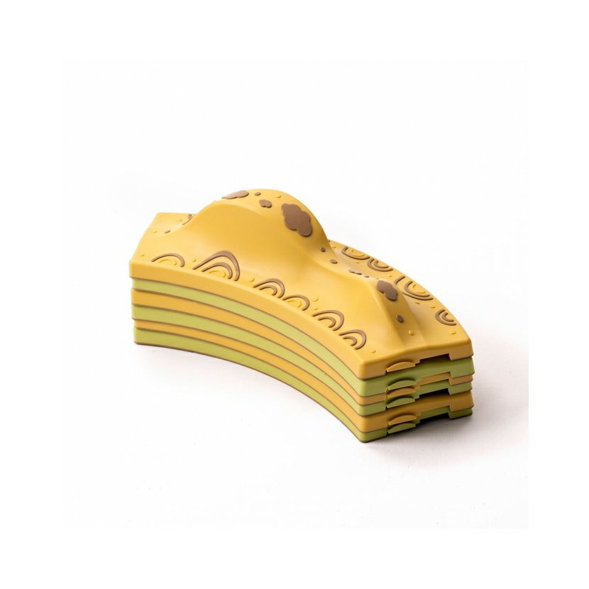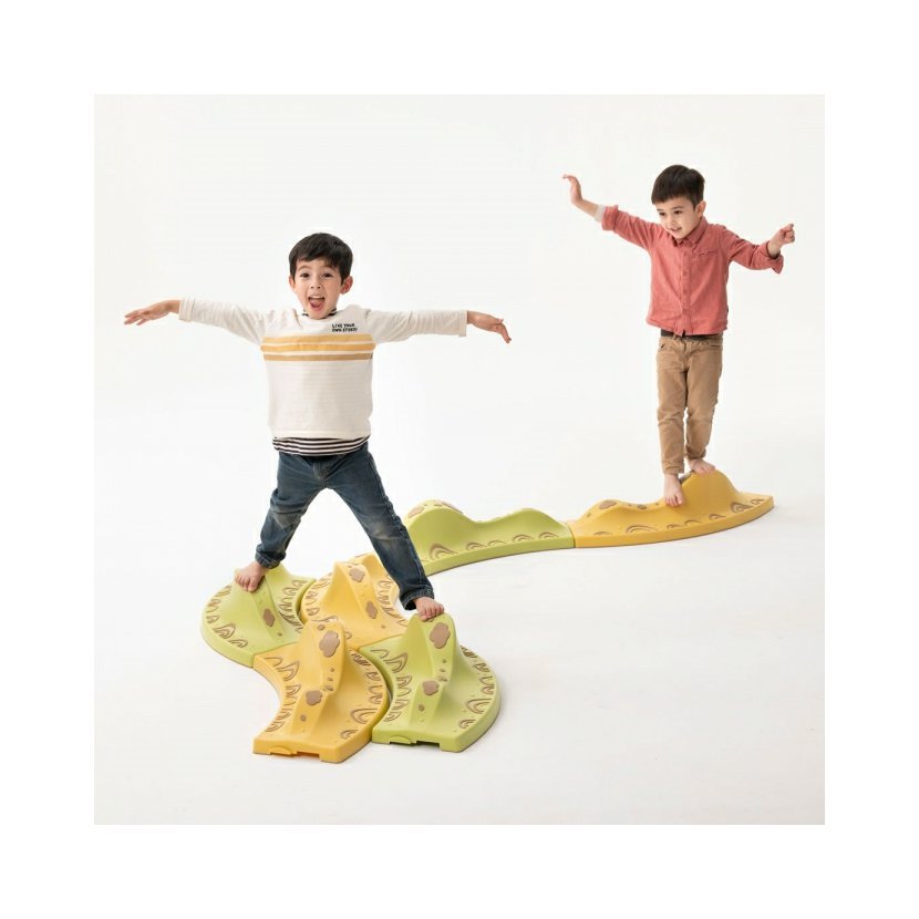 Lze jej také propojit se Zvlněnými chodníčky a vytvořit tak různé balanční trasy. Protiskluzové vzory jsou inspirovány mraky nad horou a řekou tekoucí v údolí. Designy oslovují děti a zajišťují bezpečnost.