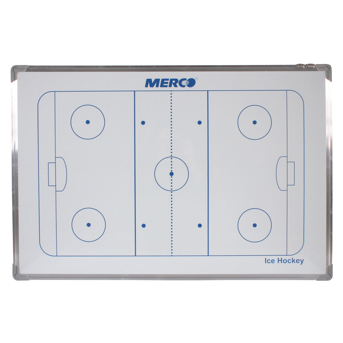 Oboustranná magnetická trenérská tabule Merco Hockey 90 patří mezi základní vybavení každé šatny soutěžního hokejového klubu pro plánování herní strategie a analýzu výkonů hráčů. Tabule s rozměry 90 x 60 x 2 cm a hmotností přibližně 2 kg znázorňuje na jedné straně celé hokejové hřiště. Na druhé straně je ze dvou třetin znázorněná polovina hřiště a tabulka pro soupisku hráčů. Pro rozmístění hráčů v poli využijete dvě sady magnetů s čísly (8 neonově žlutých, 8 neonově oranžových a 4 modré). Pro znázornění dalších strategických pokynů poslouží černý popisovač s houbičkou. Oboustranná magnetická deska je usazena v hliníkovém rámečku, který je doplněný dvěma posuvnými háčky pro možnost zavěšení na zeď.