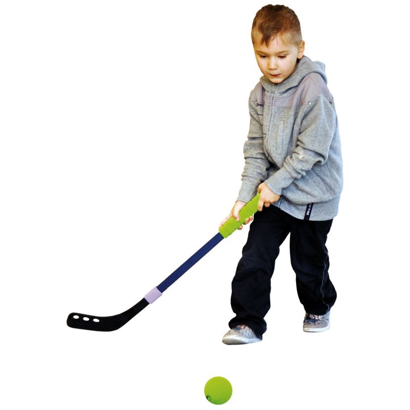 Není třeba žádného ledu a můžeme hrát hokej v interiéru i venku. Míček nahradí puk. Měkké úchopy hokejky se dobře drží v ruce.