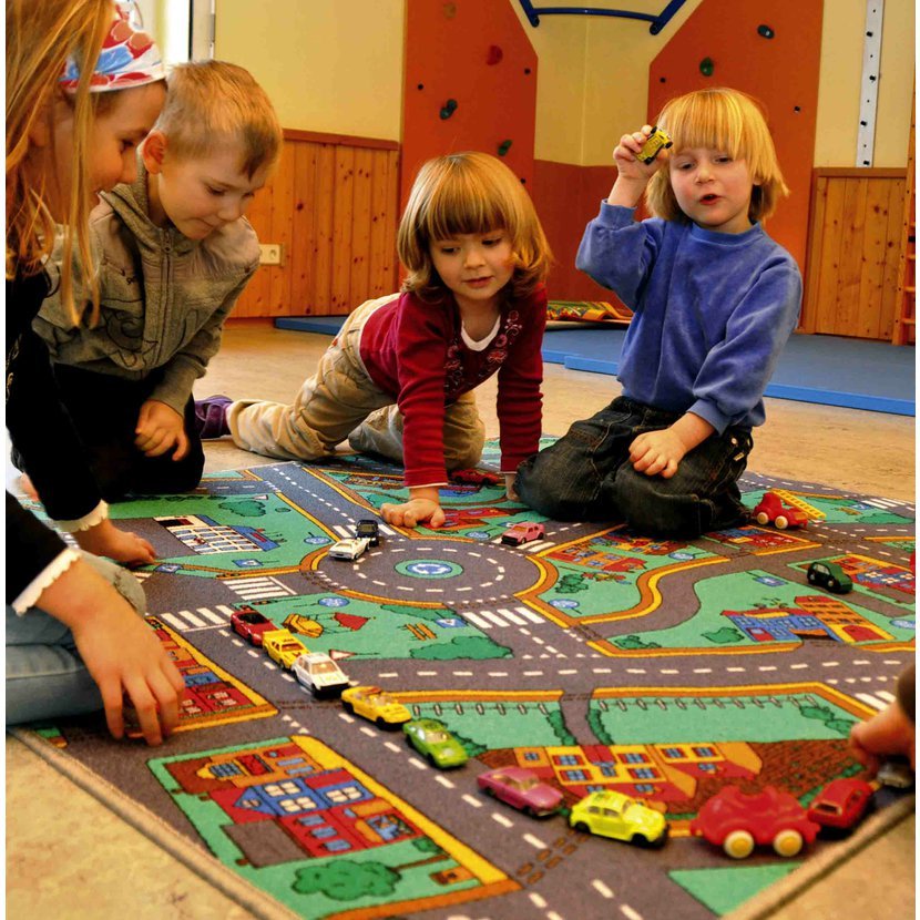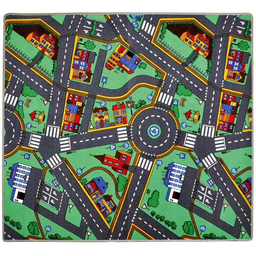 ....sanitka je tady. Na tomto koberci nejde jen o silniční provoz. Od polikliniky k hračkářství se vždy něco děje. Na silnici, cyklostezce i na kruhovém objezdu. Oh, semafor ukazuje červenou, chodci chtějí přejít po přechodu a já zde musím dávat přednost. Upss, teď jsem zajel do slepé ulice. Konečně jsem dorazil a všechna parkovací místa jsou obsazená…Pro malé je to jen koberec na hraní, ti velcí mohou na tomto koberci procvičovat dopravní značky a pravidla.Bez dopravních prostředků.