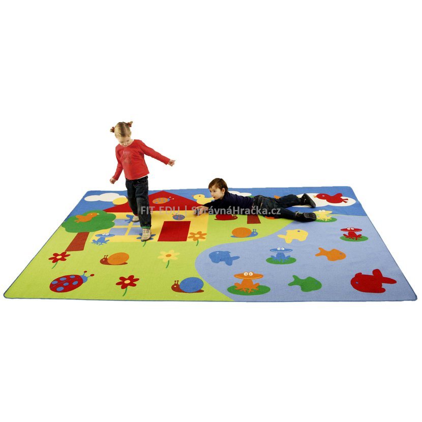 Kolik ryb plave v rybníce? Kolik červených zvířátek se schovává na louce? Děti se na tomto koberci učí počítat a rozeznávat barvy. Kolem dokola olemován.