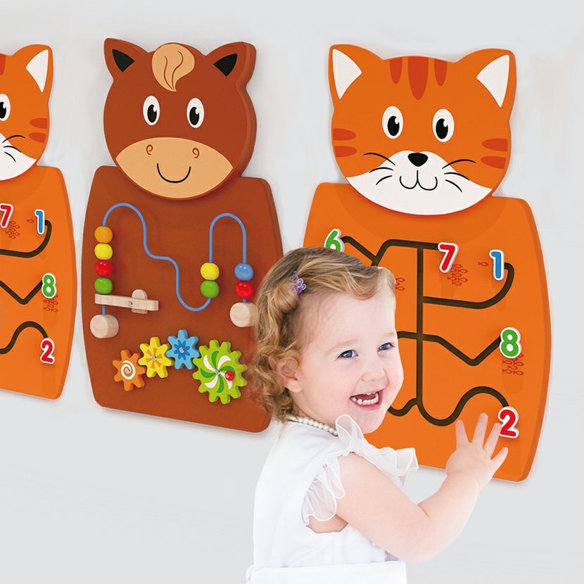 Nástěnný prvek má krásný, moderní design a nabízí sofistikovanou zábavu s velkým učebním potenciálem. Děti prozkoumávají zrakem i hmatem.