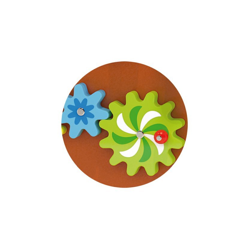 Barevné korálky a ozubená kolečka lákají děti k posouvání a otáčení.
