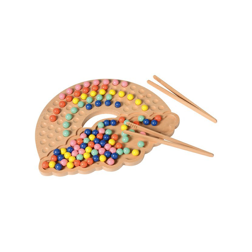 obsah: dřevěná hrací deska (29 x 23 x 1,5 cm), 110 kuliček v 5ti barvách, 2 dřevěné pinzety (17,5 cm), výchovně vzdělávací cíl: rozvoj jemné motoriky, logického myšlení a vnímání barev, materiál: bukové dřevo, věk: 3+,
