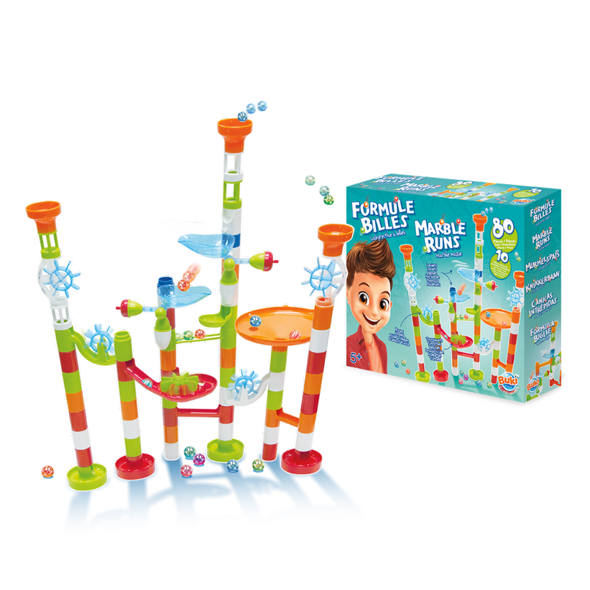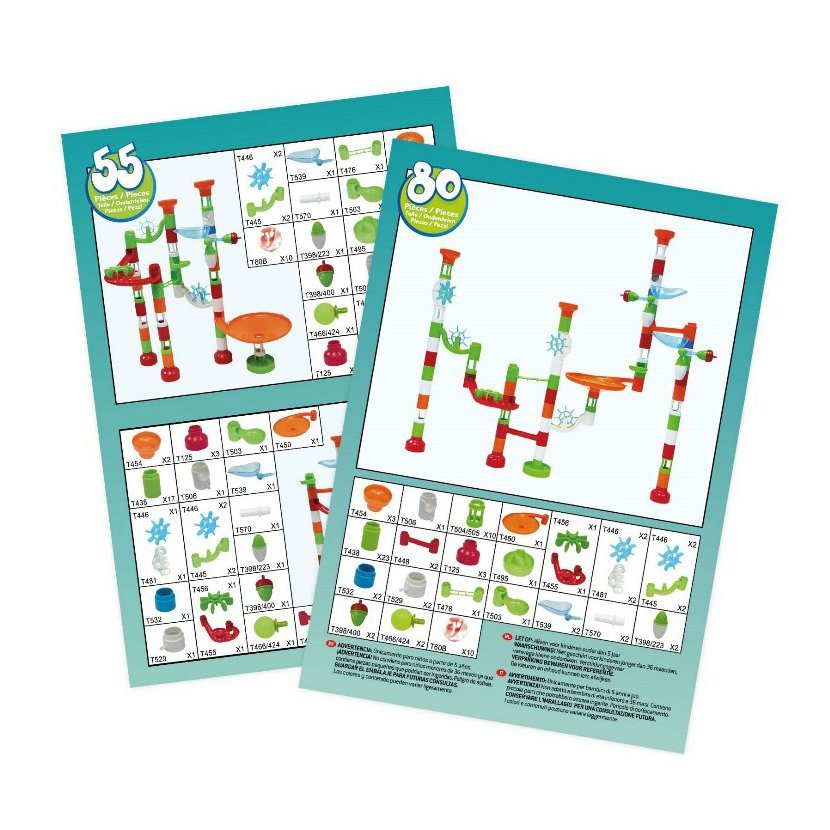 Obrázkový návod obsahuje několik různě náročných variant kuličkodráhy a další můžete vytvořit propojením více stavebnic nebo díky vlastní fantazii. Obsahuje 80 dílků a 10 kuliček.