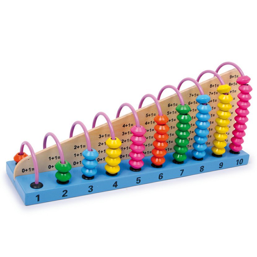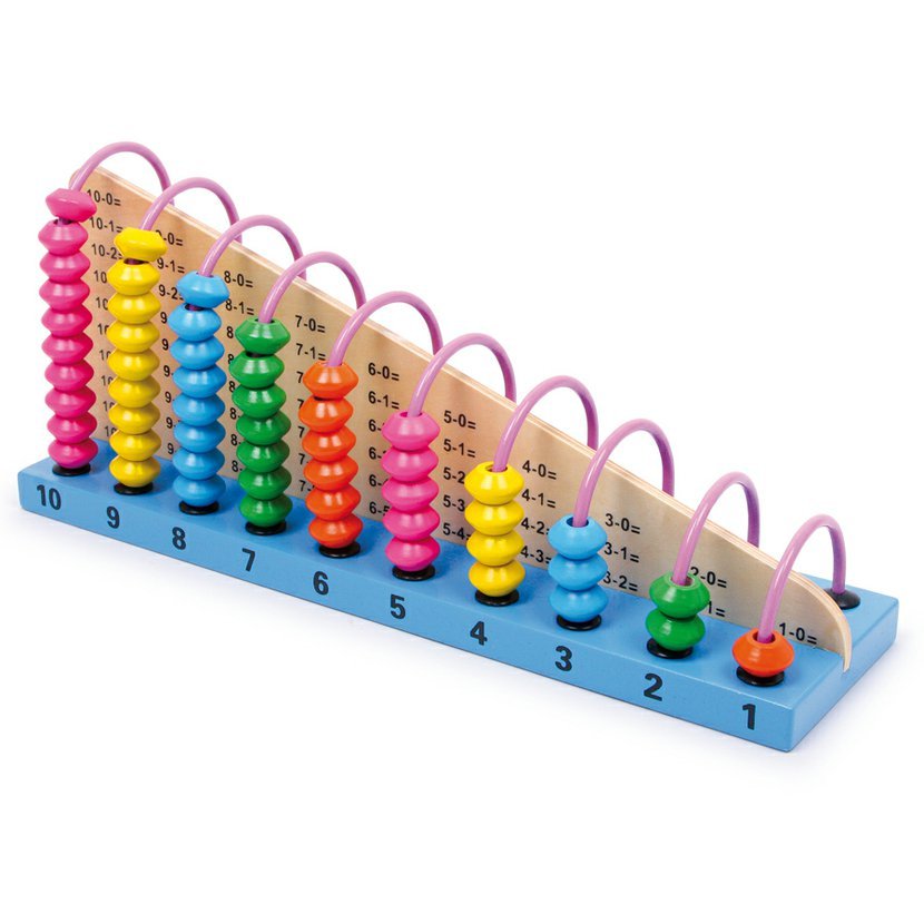 Výzva pro malé matematiky! 55 matematických úloh je zobrazeno na každé straně prostřední desky na jedné straně sčítání, na druhé odčítání. Dřevěné perly slouží jako vizuální pomůcka pro správný výpočet.