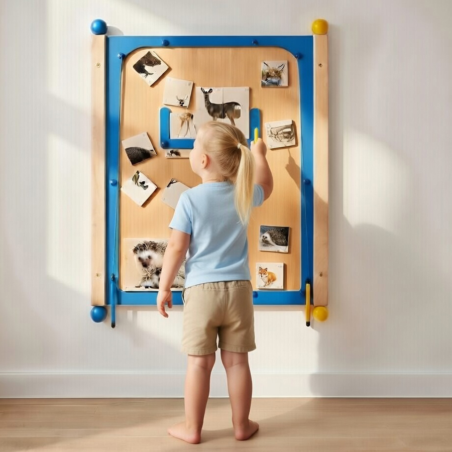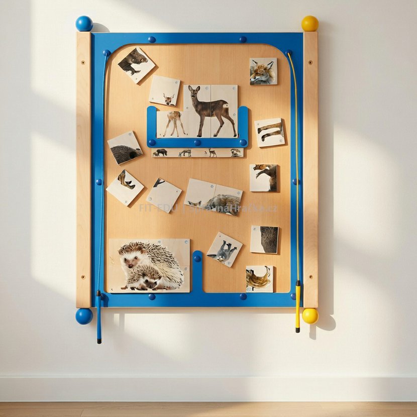 velikost 80 x 56 cm, uzavřený systém, stabilní systém uchycení s odstupem od stěny, obsahuje montážní set, pro 1 nebo dvě děti od 18 měsíců. Nástěnné hry představují atraktivní prostř