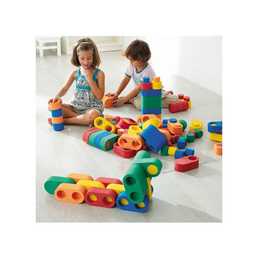 obsah: celkem 95 kusů (válec průměr 5,3 cm, v = 5 cm, 5 ks od každé barvy, válec průměr 8 cm, v = 5 cm, 2 ks od každé barvy, oválný díl se dvěma otvory, 16 x 8 x 5 cm, 12 ks od každé barvy)