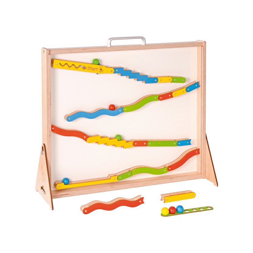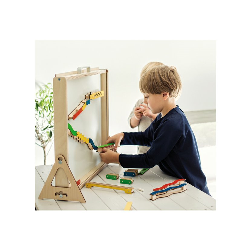 Díky trojúhelníkové základně, která se upevní po stranách kufru nám zůstane pevně stát a můžeme ho využít jako magnetickou tabuli, klasickou tabuli na malování křídami nebo jako kuličkovou dráhu. Magnetická kuličková dráha drží na bílé tabuli. Jednotlivé díly dráhy lze libovolně kombinovat a experimentovat s jejich tvary, různým náklonem dráhy nebo rozestupy mezi jednotlivými úseky. Fantazii se meze nekladou.