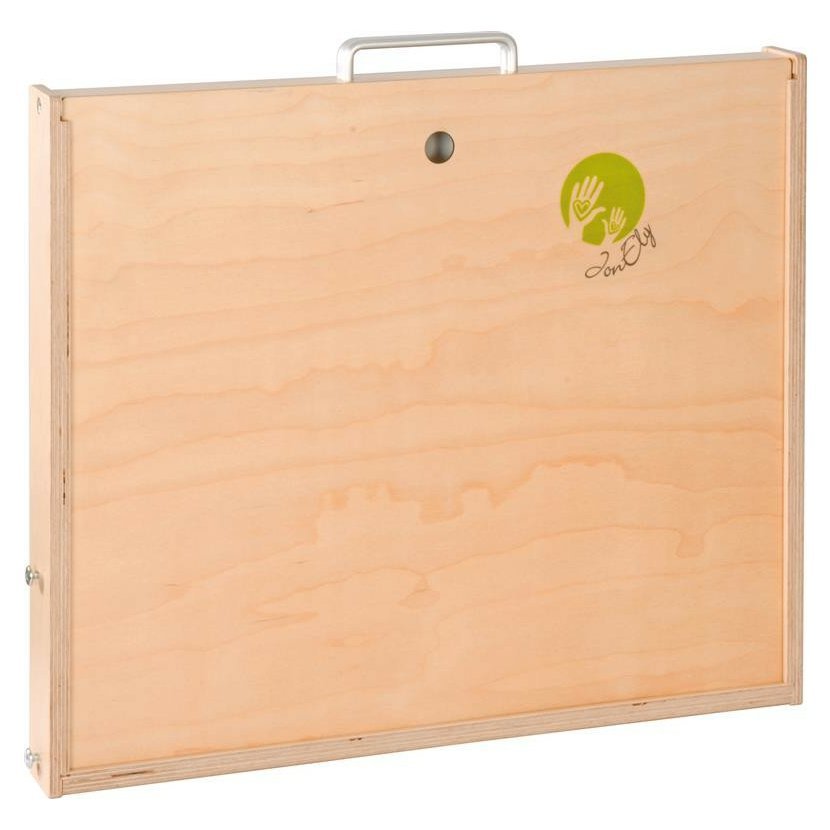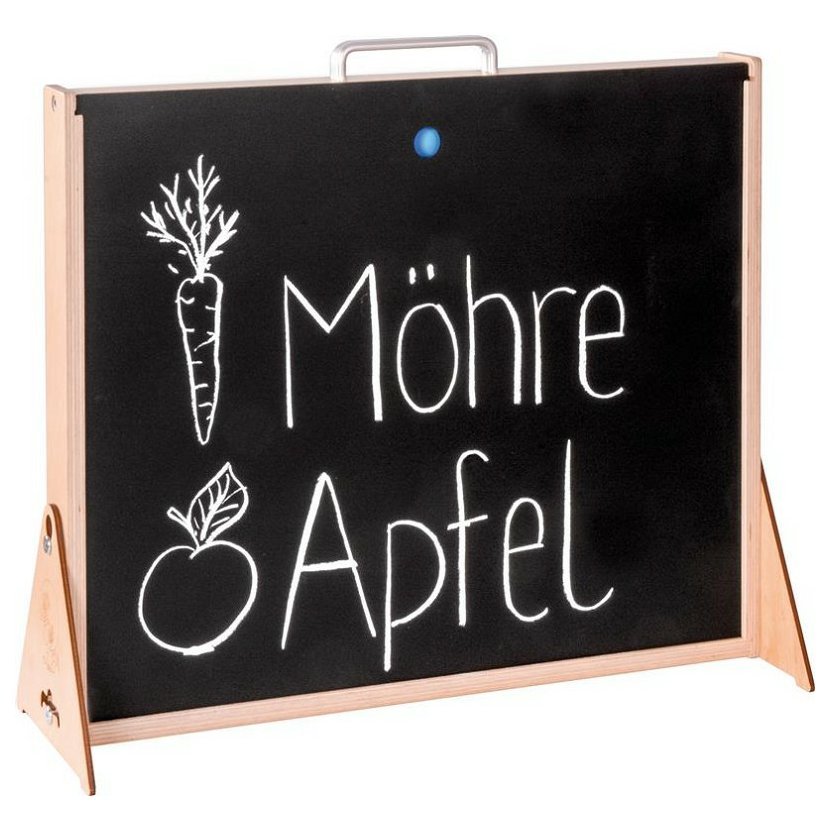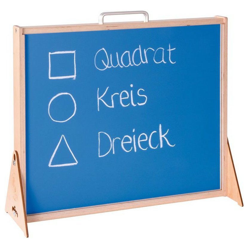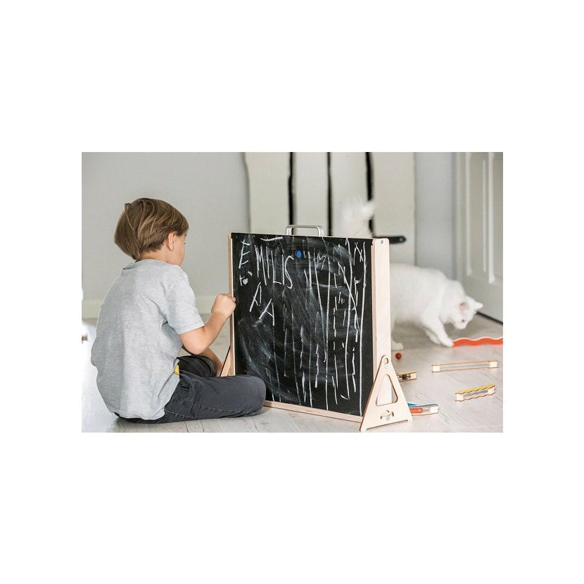 Díky trojúhelníkové základně, která se upevní po stranách kufru nám zůstane pevně stát a můžeme ho využít jako magnetickou tabuli, klasickou tabuli na malování křídami nebo jako kuličkovou dráhu. Magnetická kuličková dráha drží na bílé tabuli. Jednotlivé díly dráhy lze libovolně kombinovat a experimentovat s jejich tvary, různým náklonem dráhy nebo rozestupy mezi jednotlivými úseky. Modrá zadní strana tabule a černá zadní strana posuvného krytu lze využít jako klasická tabule na křídy.