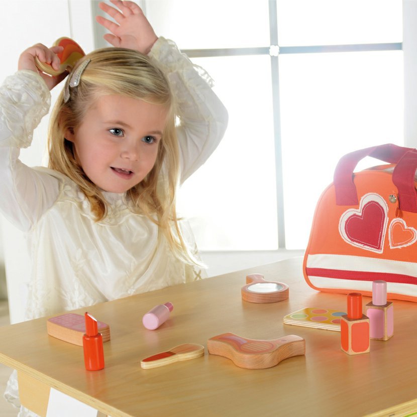 V této úchvatné lněné kabelce se srdíčky se ukrývá všechno, co děvčata nesmírně zbožňují. Chtějí být krásné jako princezny. Obsahuje rtěnky, laky na nehty, fén na vlasy, hřeben, oční stíny, štětěc, zrcátko a mobil, aby mohly kdykoliv zavolat své nejlepší přítelkyni.