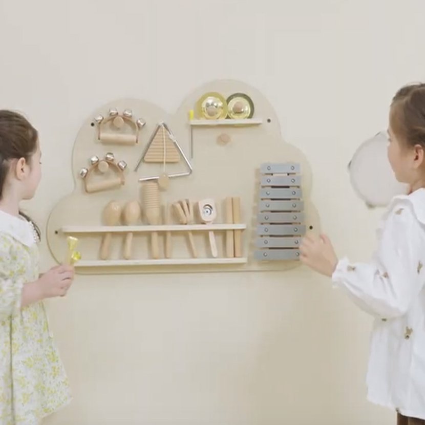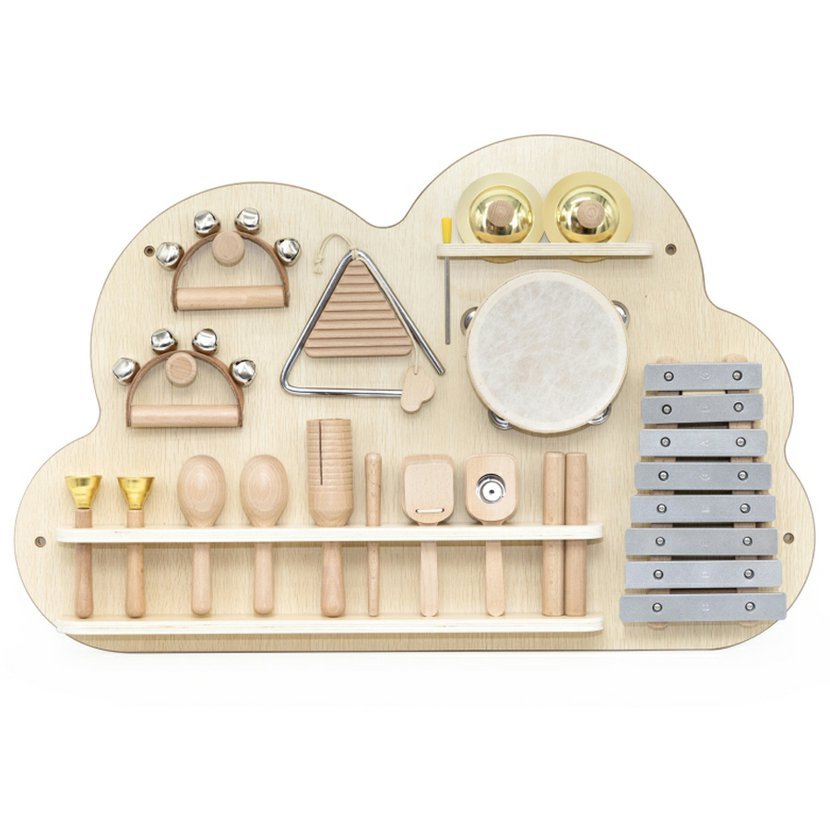 Tato originální sada hudebních nástrojů děti nejen baví, ale také rozvíjí jejich hudební cítění a motoriku. Je umístěná na dřevěné desce ve tvaru roztomilého mráčku, který děti okamžitě zaujme.