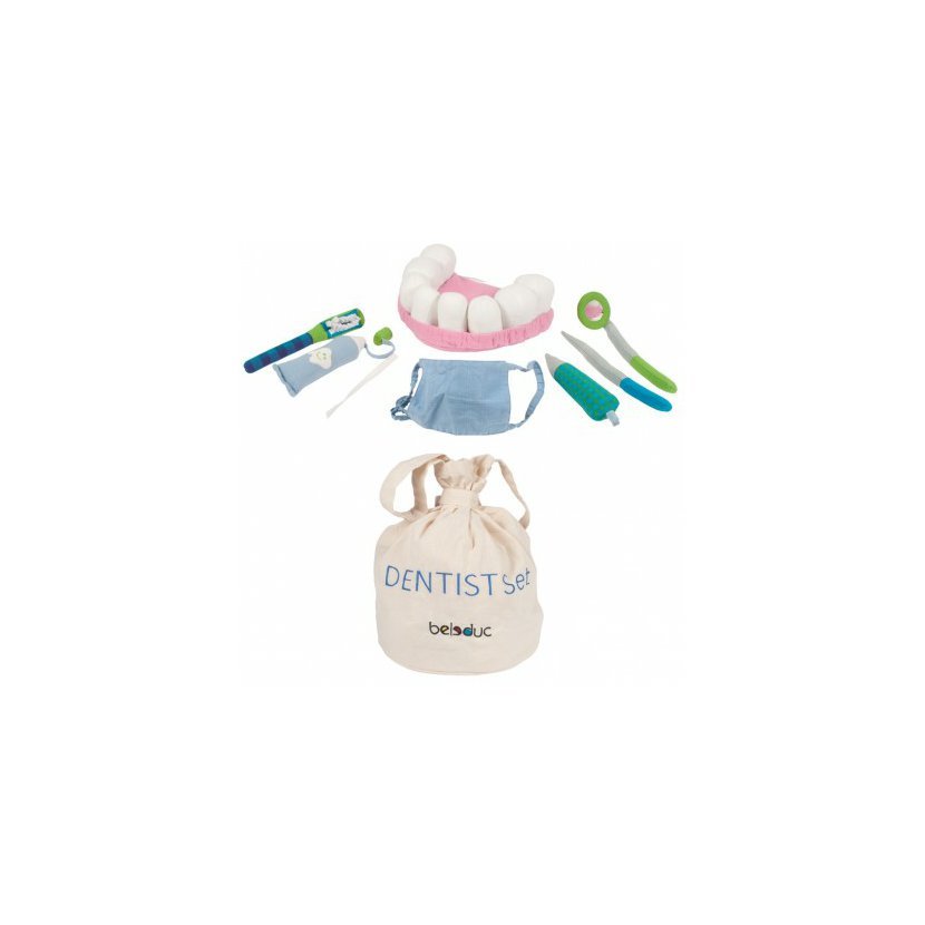 Obsah: 16 kusů z bavlny (vše uložené v bavlněném vaku) 1 čelist 8 zubů (2 řezáky, 2 špičáky, 2 stoličky 1 kartáček na zuby 1 tuba zubní pasty 1 zubní nit 3 nástroje (1 zrcadlo, 1 sonda, 1 vrták)