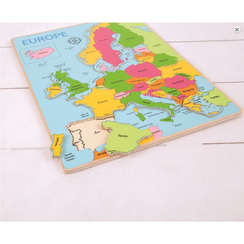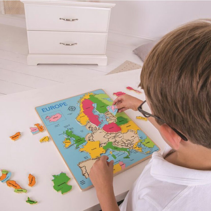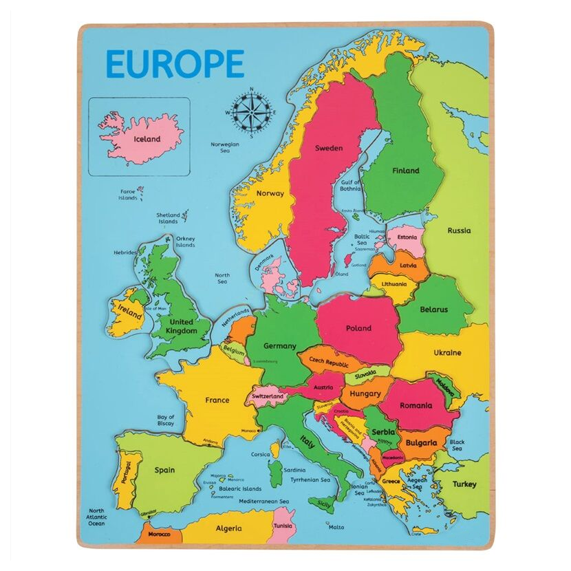 Tato fantastická mapa Evropy zajisté okouzlí zvědavé děti, které se naučí, jak je Evropa spojená. Děti se učí složení Evropy pomocí umísťování jednotlivých dílků na základní desku. Každý díl vkládačky je na ní vyznačen. Pomáhá zlepšit geografické a obecné znalosti.