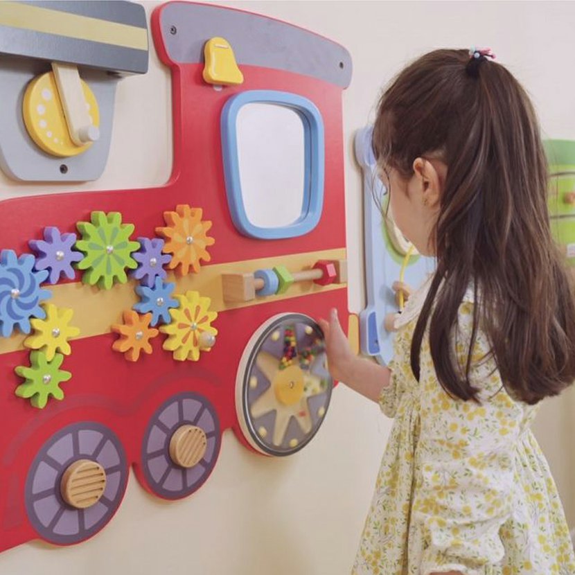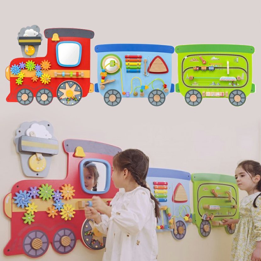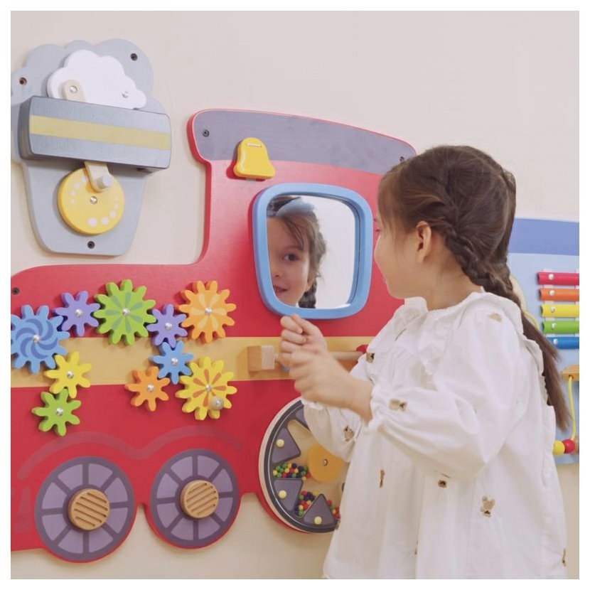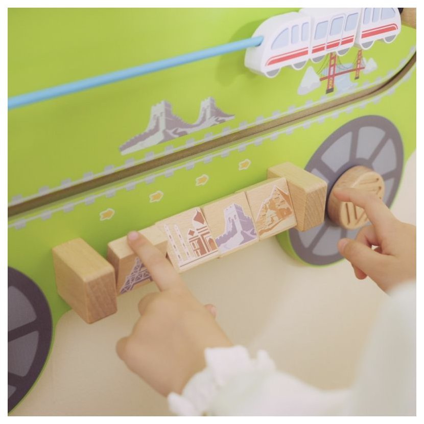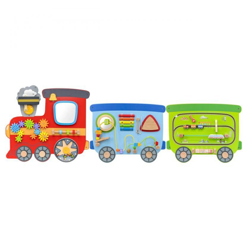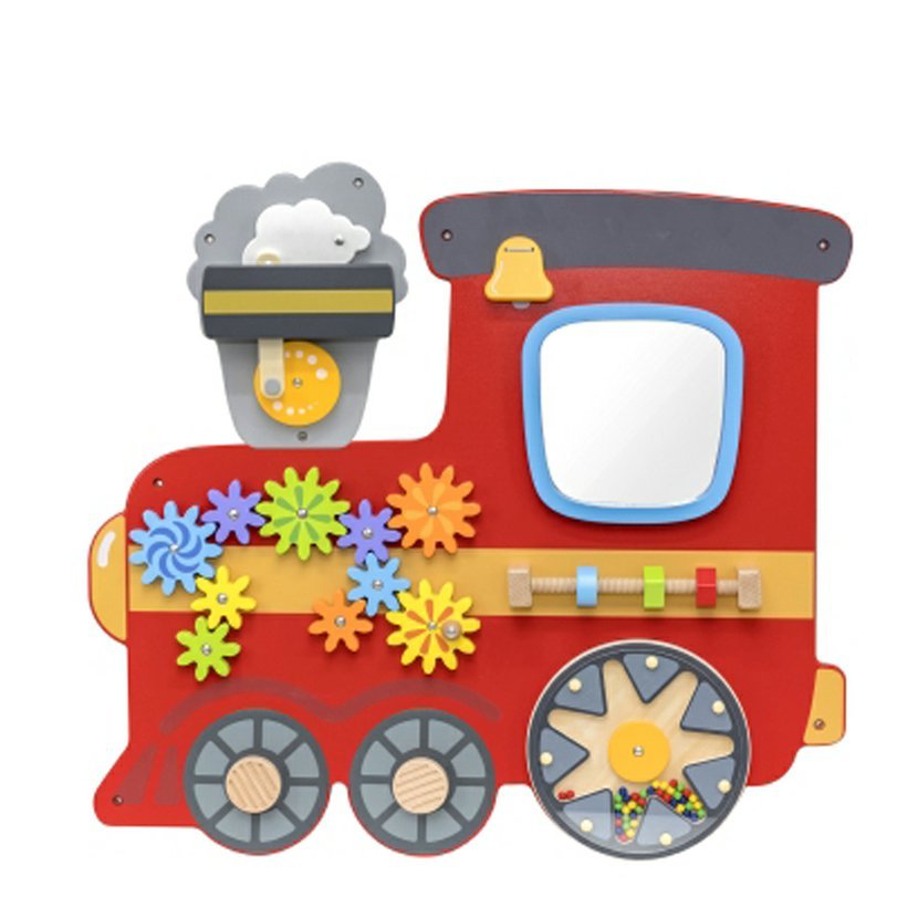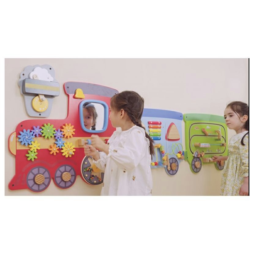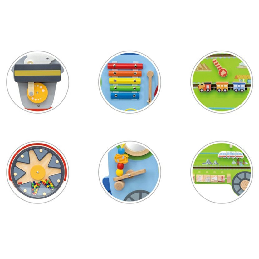Každá z těchto částí je pečlivě navržena, aby stimulovala zrak, sluch i jemnou motoriku dětí, přičemž všechny části mašinky jsou bezpečně vyrobeny z kvalitního lakovaného dřeva a natřeny netoxickými barvami.