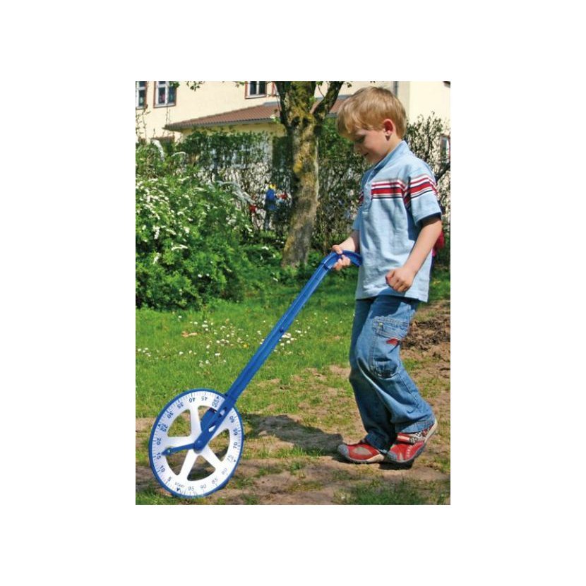 Jak daleko je to k…? S tímto měřícím kolem mohou být měřeny vzdálenosti. Ideálně abychom založili stejně velké hrací pole. Počítadlo klikne po každém metru. Jedno otočení kola znamená 100 cm. Jednoduchá montáž.