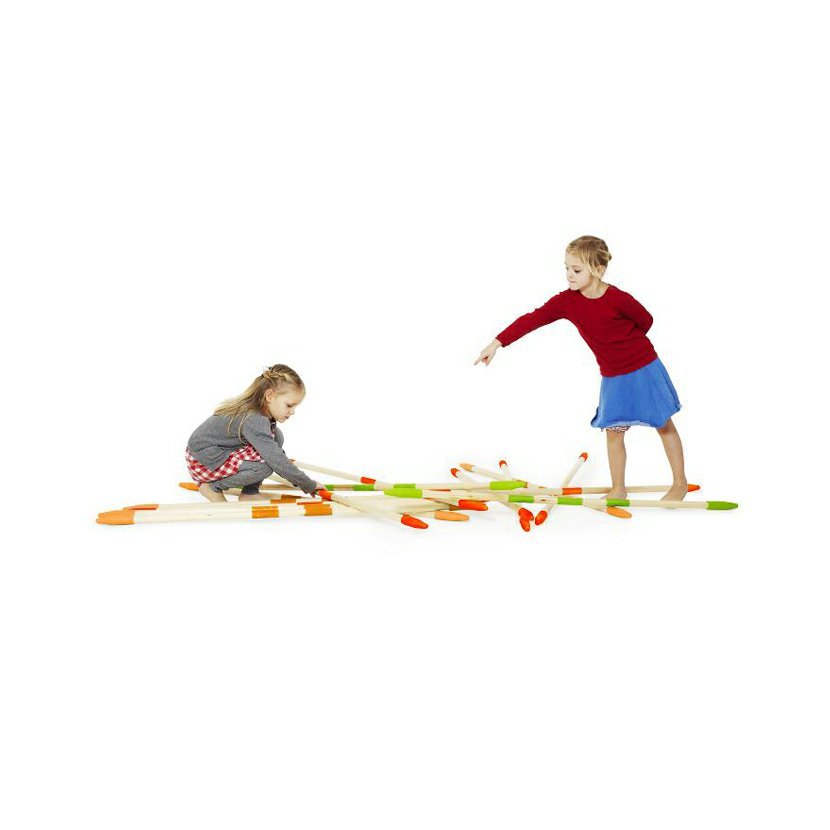 Jedno nebo více dětí drží celý svazek tyček před rozhozením co nejblíže u země a na daný povel tyče pustí a odstoupí od sebe. Hra začala a děti mohou začít vyndavat jednotlivě své tyče nebo pracovat společně a rozvíjet tak týmovou spolupráci.