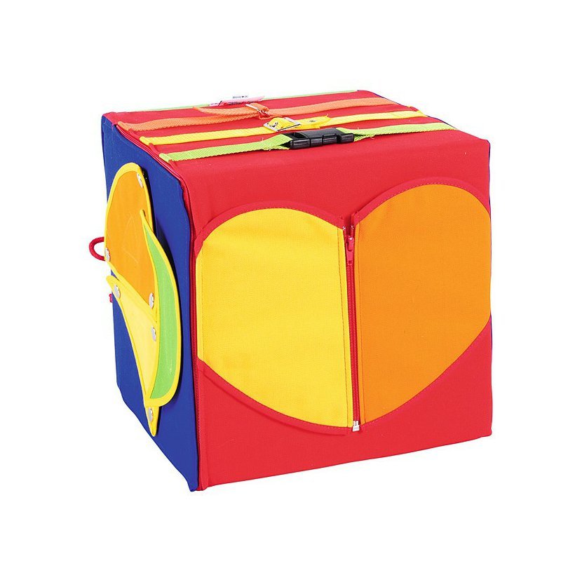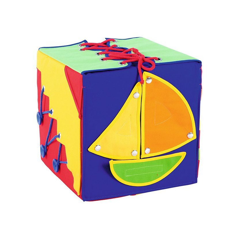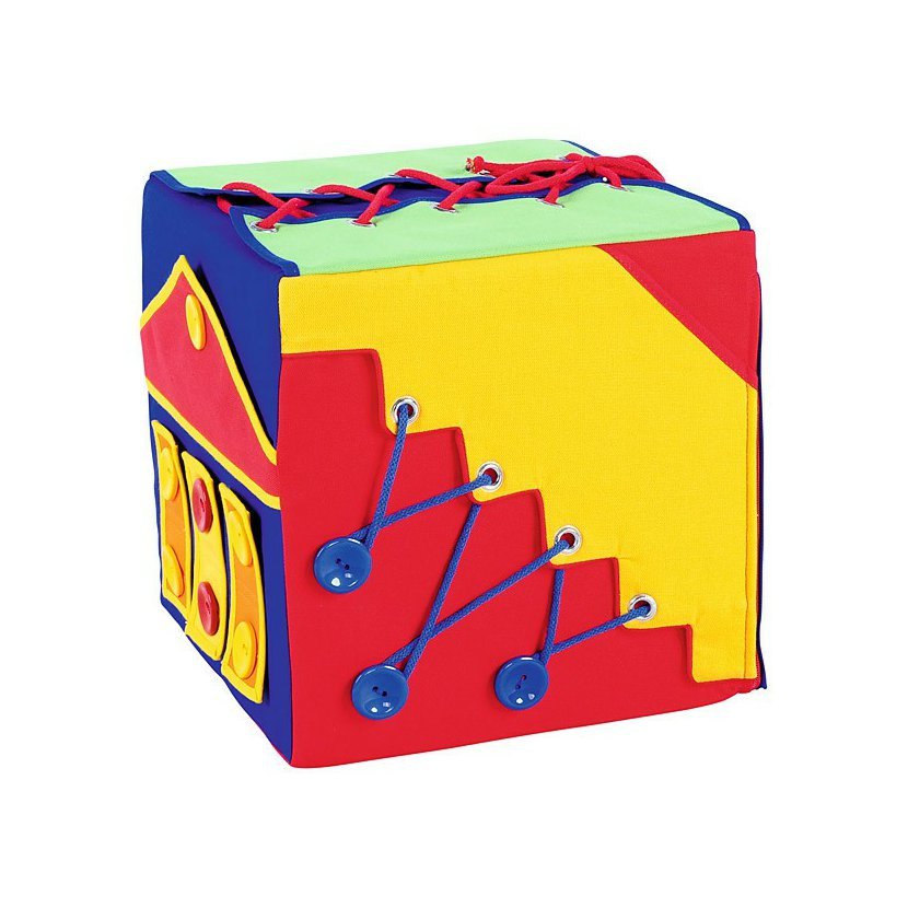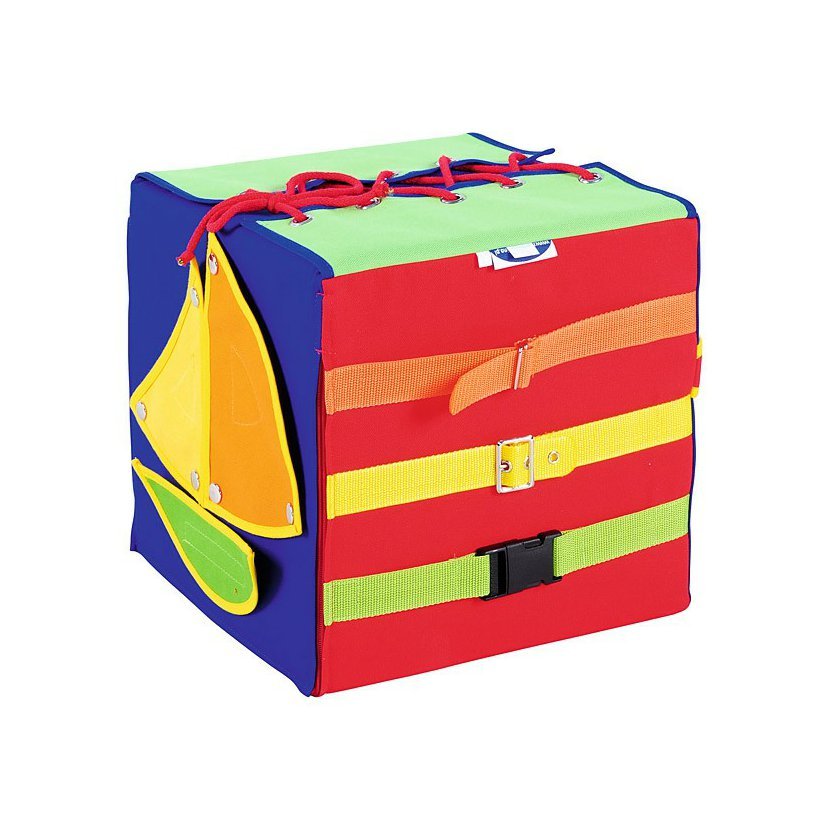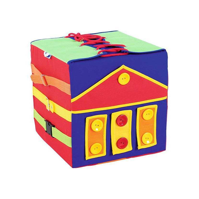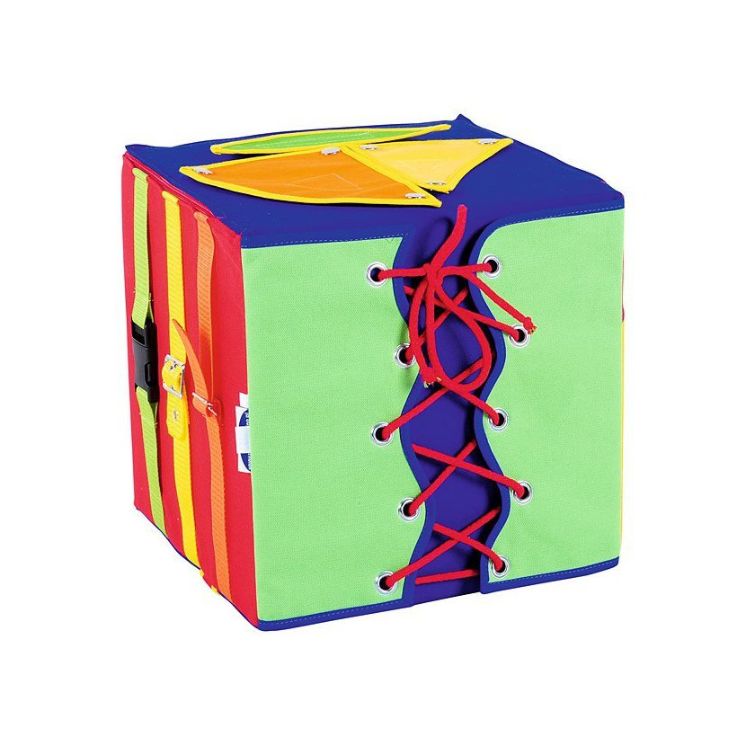 Molitanové krychle v pestrobarevném povlaku pro nácvik ovládání různých druhů zapínání oděvů a obuvi.