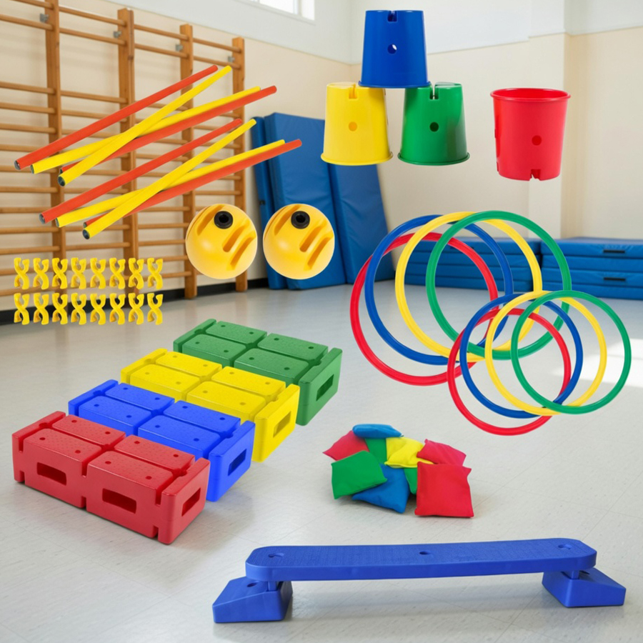 Univerzální motorická sada určená pro rozvoj základních pohybových dovedností dětí – balancování, skákání, přecházení, házení i přesnost pohybu. Díky své variabilitě umožňuje snadno vytvářet překážkové dráhy uvnitř i venku. Je ideální pro mateřské školy, školní družiny, pohybové kroužky nebo domácí použití.