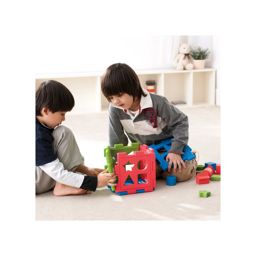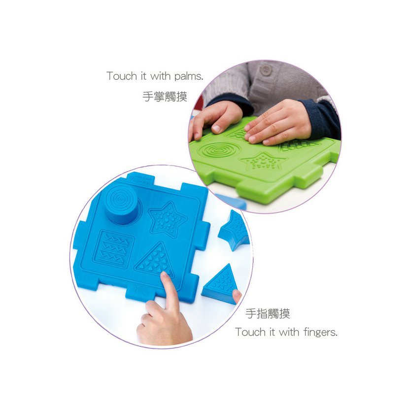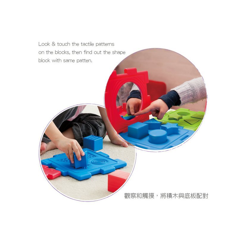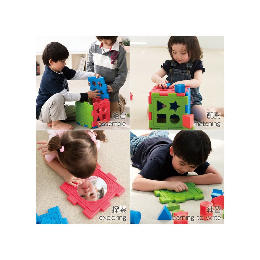 Geometrické tvary různých výšek napomáhají dětem vytvořit si koncepty výšky a posloupnosti. Přiřazování kostek k otvorům na panelech podporuje rozeznávání tvarů a vzorů. Zrcadlový panel stimuluje visuální objevování. Variace 2D a 3D vzorů napomáhá dětem plně chápat koncept tvarů a prostoru. Stavební bloky umožňují dětem hrát si 2D a 3D hry. Čísla a tečky na blocích uvádějí koncepty matematiky. Děti se mohou začít učit „psát“ číslice, když pomocí prstu „sledují“ tvar na panelu.