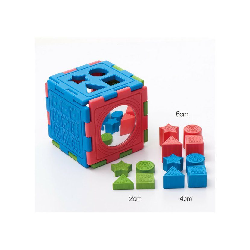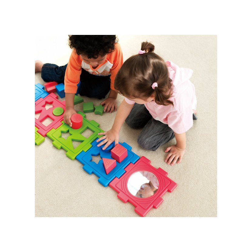 Geometrické tvary různých výšek napomáhají dětem vytvořit si koncepty výšky a posloupnosti. Přiřazování kostek k otvorům na panelech podporuje rozeznávání tvarů a vzorů. Zrcadlový panel stimuluje visuální objevování. Variace 2D a 3D vzorů napomáhá dě