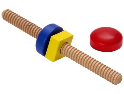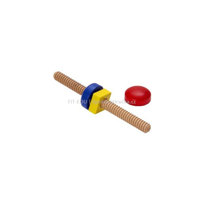 4-dílná hra ze dřeva na procvičení jemné motoriky a koncentrace. 3 dřevěné matky rozdílných tvarů a barev + 1 šroub.