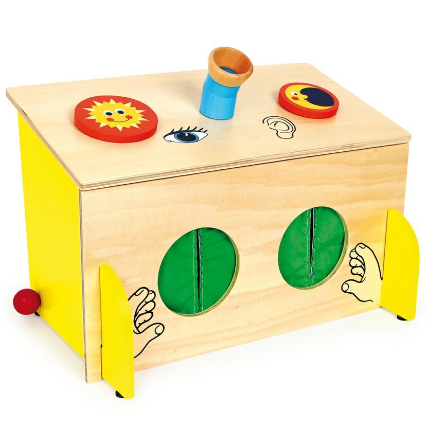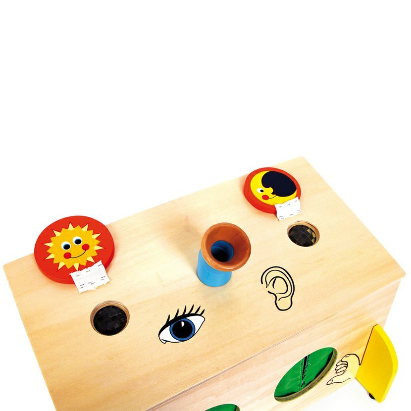 Objevujte svět pomocí hmatu! Vložte své ruce do boxu a pomocí hmatu se pokuste uhodnout, co se v boxu ukrývá. Na horním víku dřevěného boxu jsou umístěny dvě prizmatické čočky, které umožňují do vnitřku boxu nahlédnout a poskytují alespoň částečnou představu o obsahu boxu. Tyto čočky jsou jinak zakryty barevně lakovanými kryty s motivy slunce a měsíce. Malý trychtýř v horním krytu zároveň nabízí v některých případech možnost naslouchat, co se v boxu ukrývá. Hmatový box je vhodný k poznávání různých tvarů a sáčků s různými náplněmi jako např. oblázky atd.!
